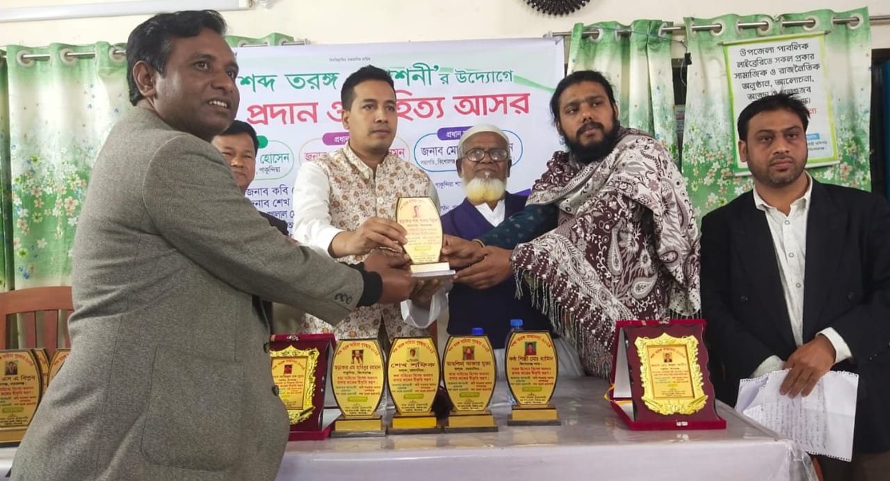 গতকাল শনিবার কিশোরগঞ্জ পাকুন্দিয়া উপজেলা পাবলিক লাইব্রেরিতে শব্দ তরঙ্গ প্রকাশনীর উদ্যোগে পদক প্রদান ও সাহিত্য আসর অনুষ্ঠিত হয় বিকাল বেলায়। প্রধান অতিথি জনাব আজিজুল হক সুমন সহকারী পরিচালক, সরকারি গণগ্রন্থাগার, কিশোরগঞ্জ। কবি আফসার আশরাফীর সভাপতিত্বে বিশেষ অতিথি ছিলেন কবি বোরহান উদ্দিন,শেখ শফিক কবি ও কথাসাহিত্যিক, জালাল মোহাম্মদ গাউছ শাওন, কবি আসিফুজ্জামান খন্দকার। অনেক কবি, ছড়াকার, শিল্পী, সাংবাদিক উপস্থিত ছিলেন।কবিতা,ছড়া, আবৃত্তি ও আলোচনা শেষে বারো জন কবি ও ছড়াকার কে বিভিন্ন ক্যাটাগরিতে শব্দ তরঙ্গ সাহিত্য পুরস্কার ২০২৪ প্রদান করা হয়। কবি, ছড়াকার ও সাংবাদিক শাহ আলম বিল্লাল কে ছড়া সাহিত্যে বিশেষ অবদানের স্বীকৃতি স্বরূপ এই পদক প্রদান করেন।