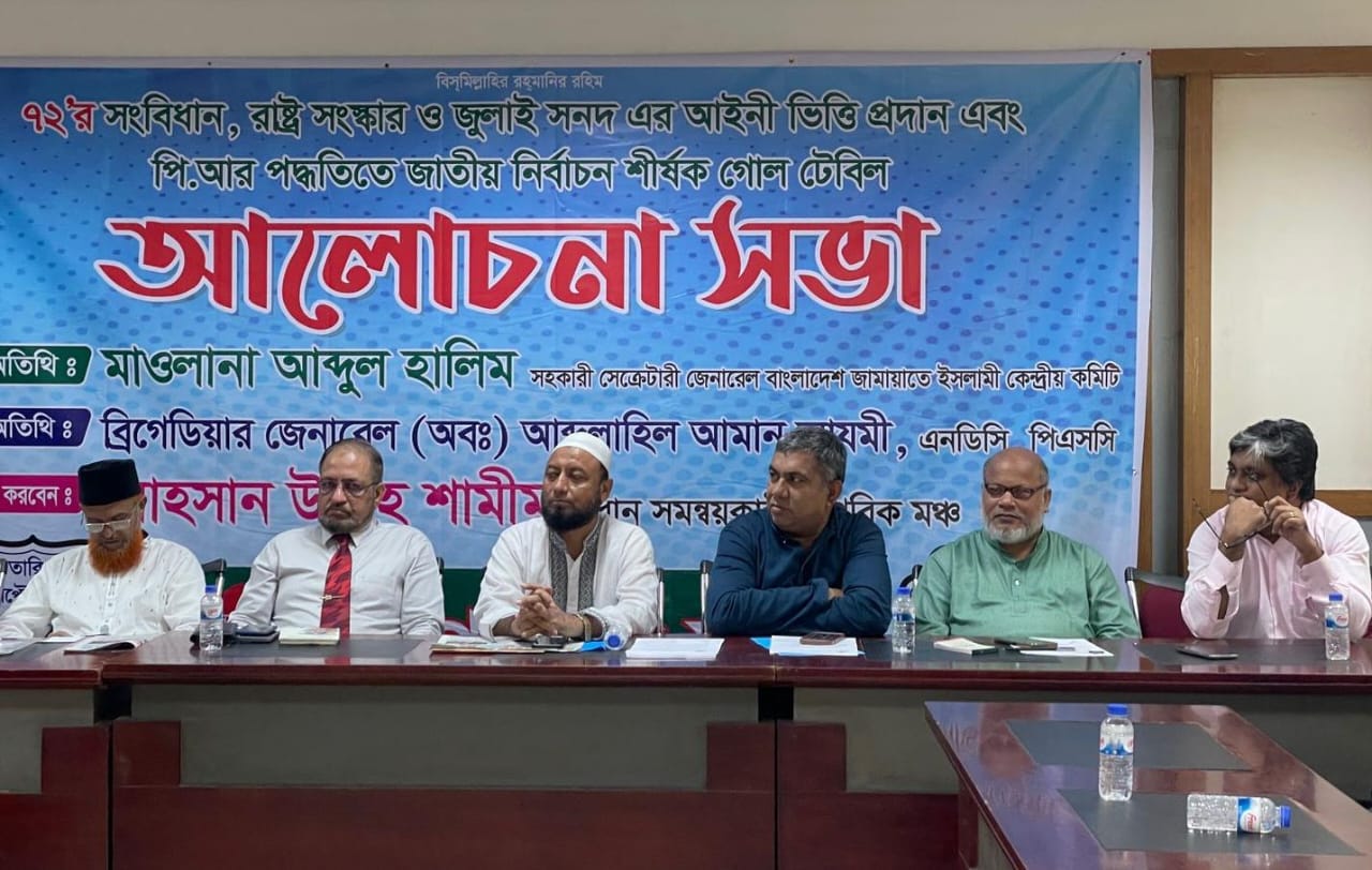 আজ সোমবার জাতীয় প্রেসক্লাবের তফাজ্জল হোসেন মানিক মিয়া হলে নাগরিক মঞ্চ আয়োজিত ‘৭২ সংবিধান, রাষ্ট্র সংস্কার ও জুলাই সনদের আইনি ভিত্তি প্রদান এবং পিআর পদ্ধতিতে নির্বাচন’ শীর্ষক আলোচনা সভায় তিনি এসব কথা বলেন।