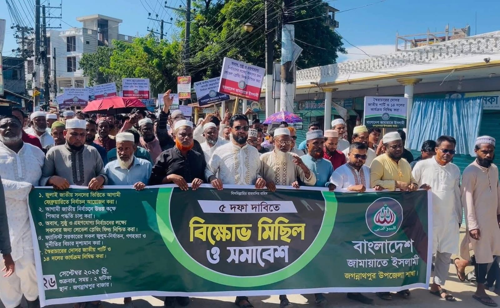 সুনামগঞ্জের জগন্নাথপুরে উপজেলা জামায়াতের উদ্যোগে কেন্দ্র ঘোষিত ৫ দফা গণদাবি আদায়ের লক্ষ্যে জগন্নাথপুর উপজেলায় ২৬ সেপ্টেম্বর শুক্রবার বেলা ২ ঘটিকার সময় বিক্ষোভ মিছিল ও সমাবেশ অনুষ্ঠিত হয়েছে।