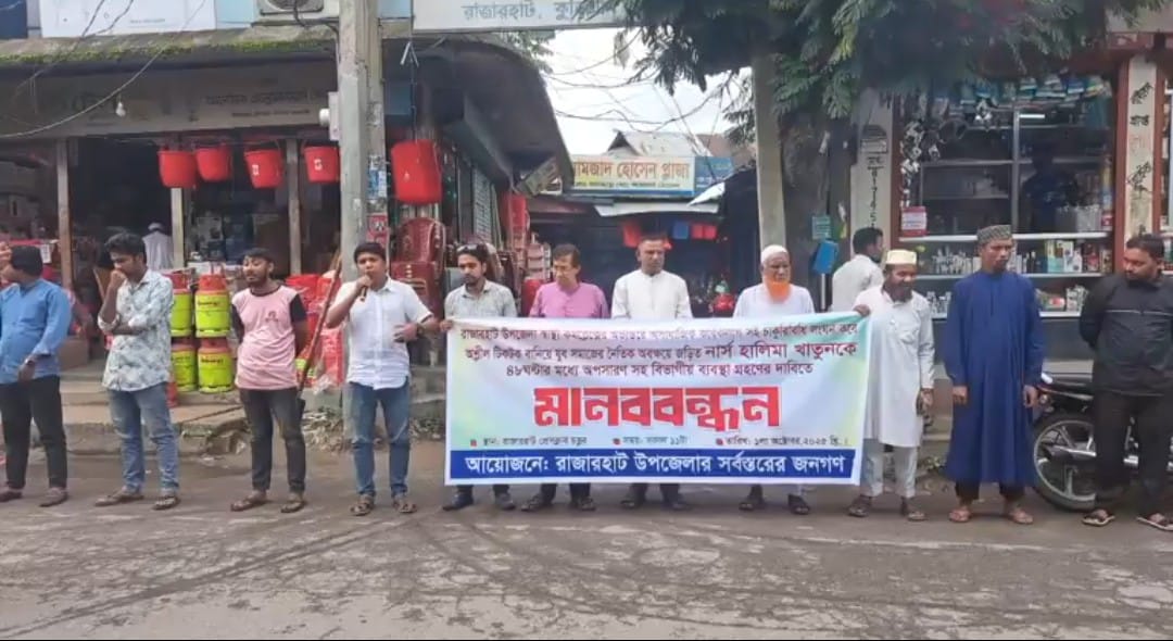 কুড়িগ্রমের রাজারহাট উপজেলা স্বাস্থ্য কমপেক্সের অভ্যন্তরে অসামাজিক কার্যকলাপ সহ চাকুরী বিধি লংঘন করে অশ্লীল টিকটক বানিয়ে যুব সমাজের অবক্ষয়ে জড়িত নার্স হালিমা খাতুনকে ৪৮ ঘন্টার মধ্যে অপসরণ সহ বিভাগীয় ব্যবস্থা গ্রহণের দাবিতে মানববন্ধন ও প্রতিবাদ সভা অনুষ্ঠিত হয়েছে। বুধবার দুপুরে রাজারহাট প্রেসক্লব চত্বরে সর্বস্তরের জনগনের ব্যানারে এই মানব বন্ধন অনুষ্ঠিত হয়।