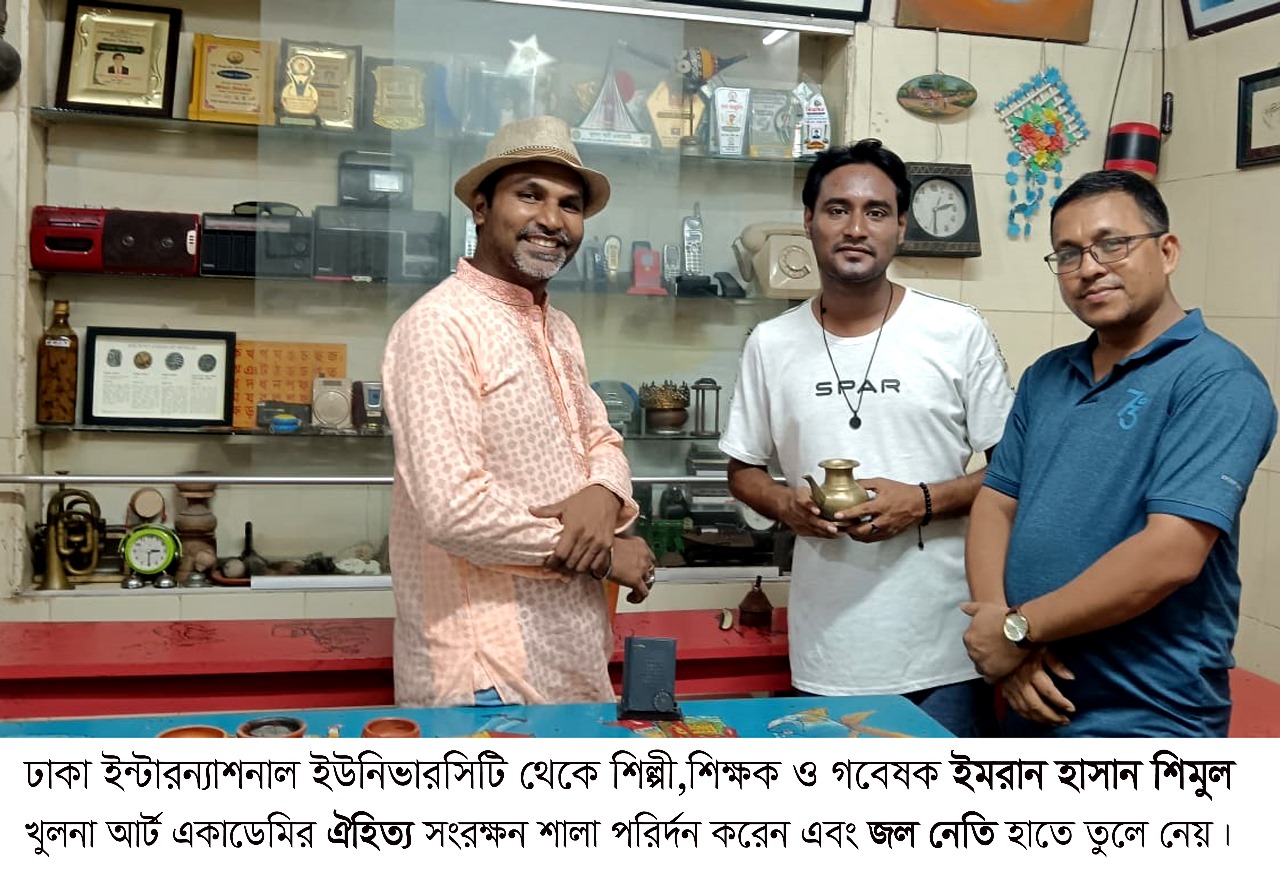 পহেলা অক্টোবর সন্ধ্যায় ঢাকা ইন্টারন্যাশনাল ইউনিভার্সিটির শিল্পী, শিক্ষক ও গবেষক ইমরান হাসান শিমুল খুলনা আর্ট একাডেমির ঐতিহ্য সংরক্ষণশালা পরিদর্শন করেন। এ সময় তিনি প্রতীকীভাবে জল নীতি হাতে তুলে নেন। সফরে তাঁর সঙ্গে ছিলেন একাডেমির প্রতিষ্ঠাতা মিলন বিশ্বাসের ছোট ভাই দীপংকর বৈরাগী, যিনি বর্তমানে ঢাকা নেভী অ্যাংকরেজ স্কুল অ্যান্ড কলেজের শিক্ষক এবং বাংলাদেশ শিশু একাডেমির প্রশিক্ষক। দীপংকর বৈরাগী ময়মনসিংহ বিশ্ববিদ্যালয় থেকে চারুকলায় পড়াশোনা শেষ করে ঢাকায় কর্মজীবন শুরু করেন। পূজা উপলক্ষে ছুটিতে এসে তিনি ঢাকায় কর্মরত অতিথি ইমরান হাসান শিমুলকে নিয়ে খুলনা আর্ট একাডেমি ভ্রমণে আসেন।