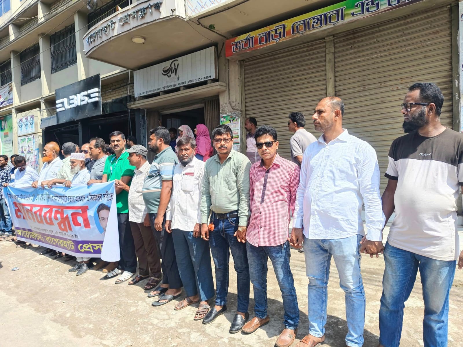 শনিবার (৪ অক্টোবর ২০২৫) দুপুরে বাগেরহাট প্রেসক্লাব চত্বরে এ মানববন্ধনের আয়োজন করে বাগেরহাট প্রেসক্লাব।