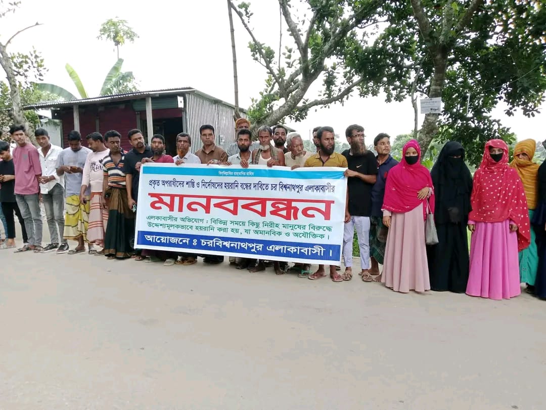 বুধবার (৮ অক্টোবর) সকালে উপজেলার চরবিশ্বনাথপুর এলাকাবাসীর উদ্যোগে এ মানববন্ধন অনুষ্ঠিত হয়।