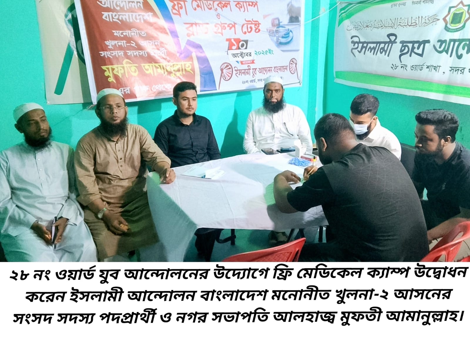 ইসলামী যুব আন্দোলন বাংলাদেশ খুলনা মহানগরীর সদর থানার ২৮ নং ওয়ার্ডের উদ্যোগে দিনব্যাপী ফ্রি মেডিকেল ক্যাম্প ও ব্লাড গ্রুপ পরীক্ষার কার্যক্রম অনুষ্ঠিত হয়েছে। শনিবার (১১ অক্টোবর) সন্ধ্যা ৬টায় টুটপাড়া মাওলার বাড়ির মোড়ে এ কার্যক্রমের উদ্বোধন করা হয়।ফ্রি মেডিকেল ক্যাম্প ও ব্লাড গ্রুপ পরীক্ষার উদ্বোধন করেন ইসলামী আন্দোলন বাংলাদেশ খুলনা মহানগর সভাপতি ও খুলনা-২ আসনের হাতপাখা মার্কার সংসদ সদস্য পদপ্রার্থী আলহাজ মুফতী আমানুল্লাহ। অনুষ্ঠানে সভাপতিত্ব করেন ইসলামী যুব আন্দোলন বাংলাদেশ ২৮ নং ওয়ার্ড সভাপতি মোঃ মইন খান। এ সময় আরও উপস্থিত ছিলেন ইসলামী আন্দোলন বাংলাদেশ খুলনা মহানগর সিনিয়র সহসভাপতি শেখ মোঃ নাসির উদ্দিন, সাংগঠনিক সম্পাদক মোঃ সাইফুল ইসলাম, ইসলামী যুব আন্দোলন খুলনা মহানগর সভাপতি মোঃ আব্দুর রশিদ, সদর থানা সাধারণ সম্পাদক মোঃ হাসান আলী, যুগ্ম সম্পাদক মোঃ আকবর আলী, ইসলামী শ্রমিক আন্দোলন সদর থানা সাধারণ সম্পাদক মোঃ আল আমিন, ২৮ নং ওয়ার্ড সভাপতি মোঃ বদরুজ্জামানসহ মোঃ ইব্রাহিম মোল্লা, মোঃ রফিকুল ইসলাম, মোঃ রমজান শেখ, মোঃ সাইফুল ইসলাম, মোঃ ফাহিমুর রহমান ও স্থানীয় গণ্যমান্য ব্যক্তিবর্গ।দিনব্যাপী মেডিকেল ক্যাম্পে স্থানীয় সাধারণ মানুষ বিনামূল্যে চিকিৎসা সেবা ও রক্তের গ্রুপ পরীক্ষার সুযোগ গ্রহণ করেন। ক্যাম্পের চিকিৎসা কার্যক্রম পরিচালনা করেন সাউথ সিটি (প্রা:) হাসপাতালের মেডিকেল অফিসার ডা. নেওয়াজ মোহাম্মদ আশিক।