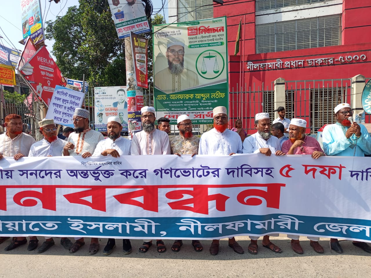 বাংলাদেশ জামায়াতে ইসলামী ঘোষিত কেন্দ্রীয় কর্মসূচির অংশ হিসেবে পাঁচ দফা দাবির বাস্তবায়নের লক্ষ্যে বুধবার (১৫ অক্টোবর) নীলফামারীতে মানববন্ধন ও মতবিনিময় সভা অনুষ্ঠিত হয়েছে।