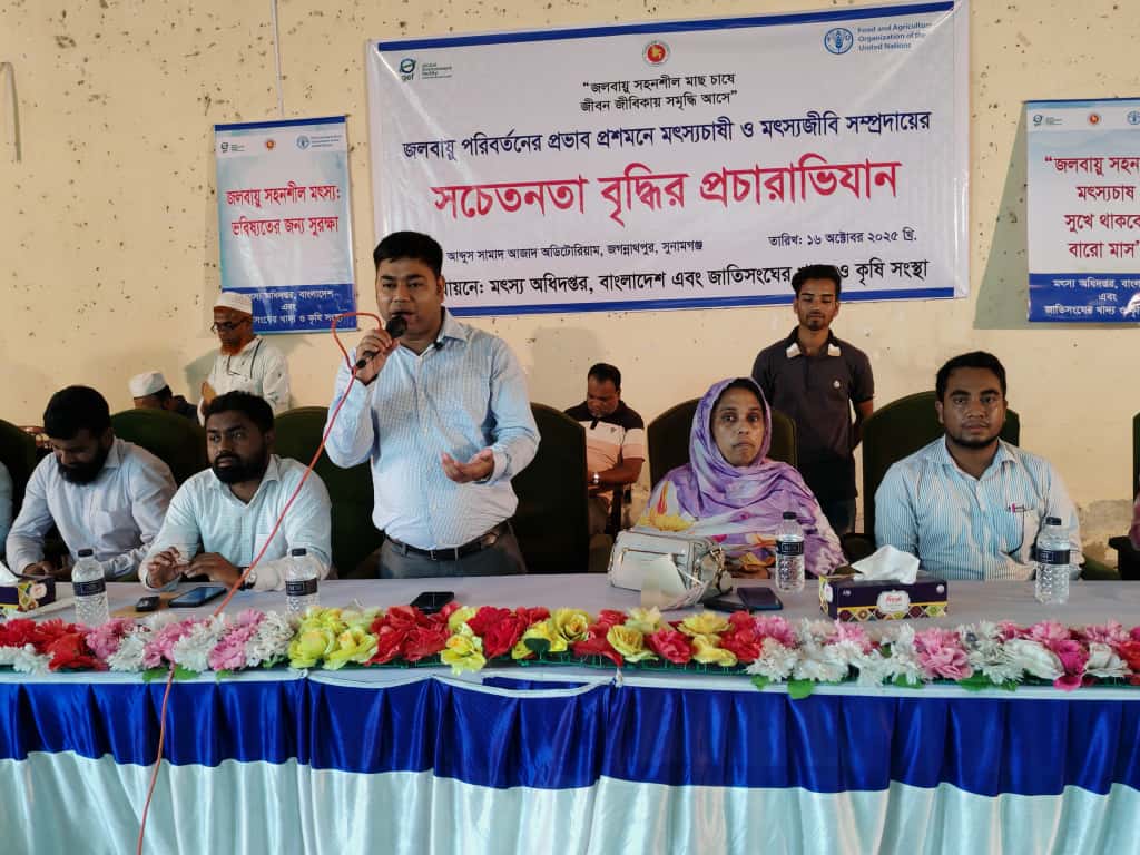 "জলবায়ু সহনশীল মাছ চাষে, জীবন জীবিকায় সমৃদ্ধি আসে’’ এই প্রতিপাদ্য বিষয় সামনে রেখে সুনামগঞ্জের জগন্নাথপুর উপজেলায় জলবায়ু পরিবর্তনের প্রভাব প্রশমনে মৎস্য চাষি ও মৎস্যজীবী সম্প্রদায়ের সচেতনতা বৃদ্ধির প্রচারাভিযান অনুষ্ঠান পালিত হয়েছে।