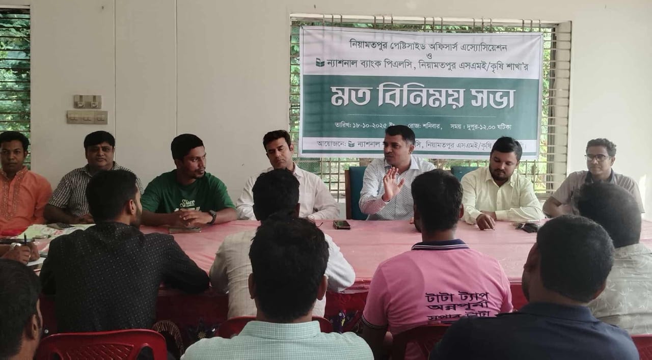 নিয়ামতপুরে ন্যাশনাল ব্যাংক লিমিটেড পিএলসি এর সাথে নিয়ামতপুর পেস্টিসাইড অফিসার এসোসিয়েশনের সকল সদস্যদের সাথে ব্যাংকিং সেবা ও সেবার মান উন্নয়ন নিয়ে এক মতবিনিময় সভা অনুষ্ঠিত হয়েছে।