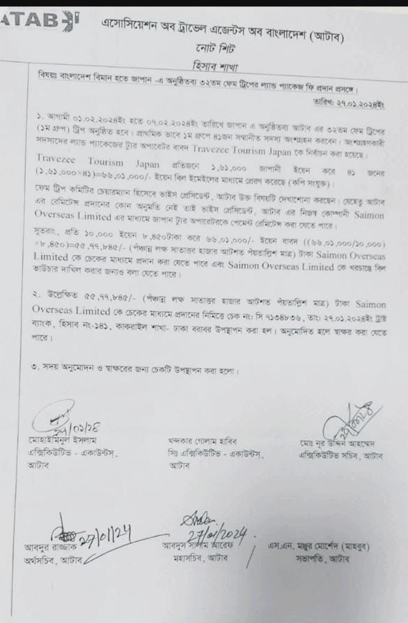 এছাড়াও জাপান ফেম ট্রিপের ৫৫,৭৭,০০০/০০ পঞ্চান্ন লক্ষ সাতান্ন হাজার টাকা পতিত আটাব কমিটির মহাসচিব আফসিয়া জান্নাত সালেহ এর নিজস্ব প্রতিষ্ঠান সায়মন ওভারসীজ লিমিটেডের নামে চেক ইস্যু করে আত্বসাত করেছে বলে প্রমাণ পাওয়া গেছে। আটাব অনলাইনের প্রায় ১ কোটি ৫০ লক্ষ টাকা দূর্নিতিবাজ সভাপতি আব্দুস সালাম আরেফ ও মহাসচিব আফসিয়া জান্নাত সালেহ আত্মসাৎ করেছে। উক্ত অভিযোগগুলো প্রমানিত হওয়ায় আটাব কমিটি বাতিল করে বানিজ্য মন্ত্রণালয়ের উপসচিব জনাব মোতাকাব্বির আহমেদকে প্রশাসক নিয়োগ করেছে বানিজ্য মন্ত্রণালয়।