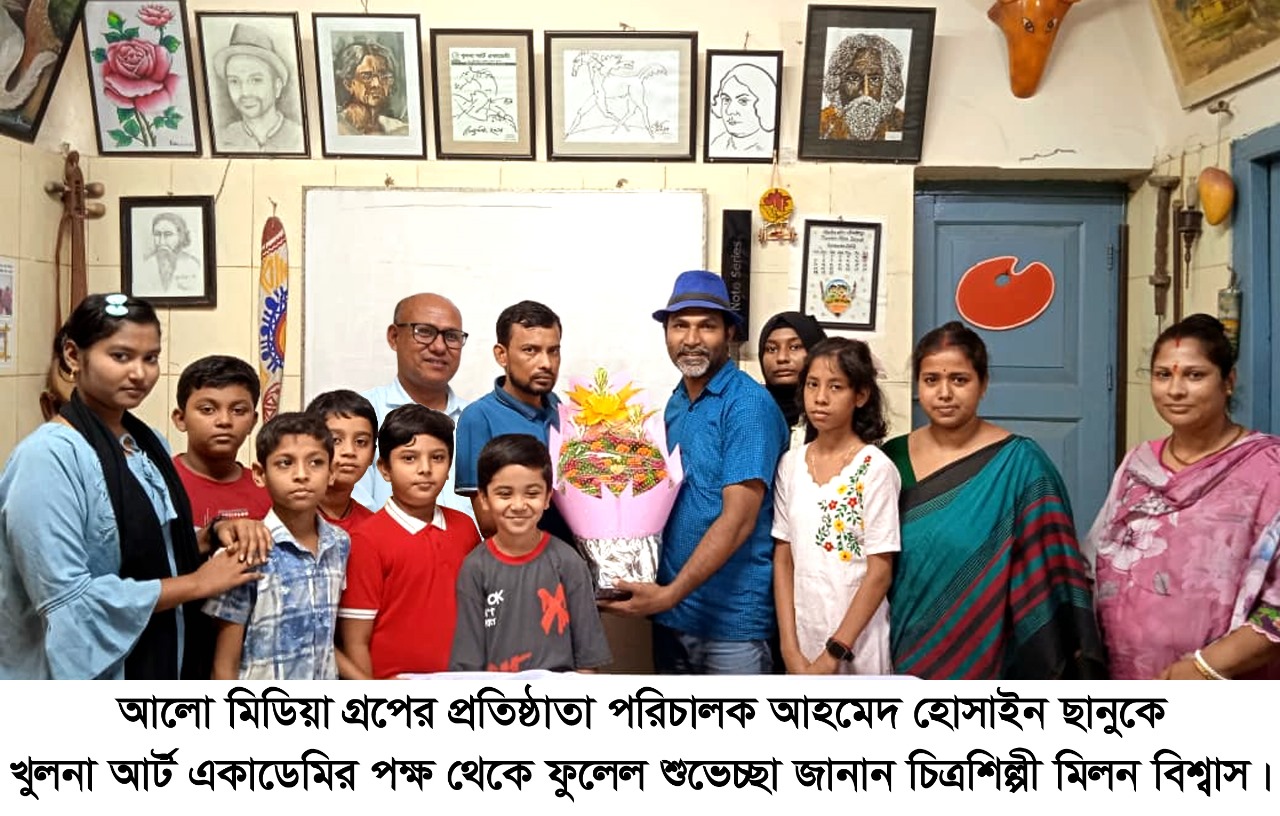 শুক্রবার সকাল ১১টায় খুলনা আর্ট একাডেমিতে অনুষ্ঠিত এক সৌহার্দ্যপূর্ণ অনুষ্ঠানে আলো মিডিয়া গ্রুপের প্রতিষ্ঠাতা পরিচালক, বিশিষ্ট সাংবাদিক ও সংগঠক আহমেদ হোসাইন ছানু ঢাকা থেকে খুলনায় পৌঁছে প্রথমেই খুলনা আর্ট একাডেমি পরিদর্শন করেন। এ সময় তাঁকে ফুল দিয়ে শুভেচ্ছা জানান খুলনা আর্ট একাডেমির প্রতিষ্ঠাতা ও পরিচালক চিত্রশিল্পী মিলন বিশ্বাস, সহকারী পরিচালক শিলা বিশ্বাস, হ্যান্ডরাইটিং শিক্ষক ধনঞ্জয় রায়, সহকারী শিক্ষিকা তানিয়া সুলতানা এবং একাডেমির শিশুশিল্পীরা।চিত্রশিল্পী মিলন বিশ্বাস শুভেচ্ছা প্রদানকালে বলেন, “আহমেদ হোসাইন ছানু সাংবাদিকতার জগতে সততা, নিষ্ঠা ও মানবতার এক উজ্জ্বল দৃষ্টান্ত। তিনি নবীন প্রজন্মকে আলোকিত করার স্বপ্ন নিয়ে কাজ করছেন। ঢাকায় থেকেও তিনি খুলনা আর্ট একাডেমির সুখ-দুঃখে পাশে থাকেন এবং আমাদের ‘সুখ পুষ্প স্মৃতি ঐতিহ্য সংরক্ষণশালা’-এর জন্য একটি ঐতিহ্যবাহী জলনেতি উপহার দিয়েছেন। আজ তাঁর আগমন আমাদের জন্য গর্ব ও আনন্দের।”শুভেচ্ছা গ্রহণ করে আহমেদ হোসাইন ছানু বলেন, “আমি এক সপ্তাহের সফরে খুলনায় এসেছি। এই সফরের মাধ্যমে খুলনা ও পার্শ্ববর্তী অঞ্চলে বিভিন্ন সামাজিক ও সাংস্কৃতিক কার্যক্রম পরিচালনা করবো। শিশুদের নিয়ে একটি বিশেষ অনুষ্ঠান করার পরিকল্পনাও রয়েছে, যেখানে চিত্রশিল্পী মিলন বিশ্বাস দাদার সহযোগিতা প্রত্যাশা করছি।”তাঁর এই বক্তব্যে শিশুশিল্পীরা উচ্ছ্বসিত হয়ে হাততালির মাধ্যমে আনন্দ প্রকাশ করে এবং অতিথিকে শুভেচ্ছা জানায়।অনুষ্ঠানের শেষে চিত্রশিল্পী মিলন বিশ্বাস আহমেদ হোসাইন ছানুর সর্বাঙ্গীণ সাফল্য ও মঙ্গল কামনা করেন এবং উপস্থিত সকলকে ধন্যবাদ জানিয়ে অনুষ্ঠান সমাপ্ত ঘোষণা করেন।