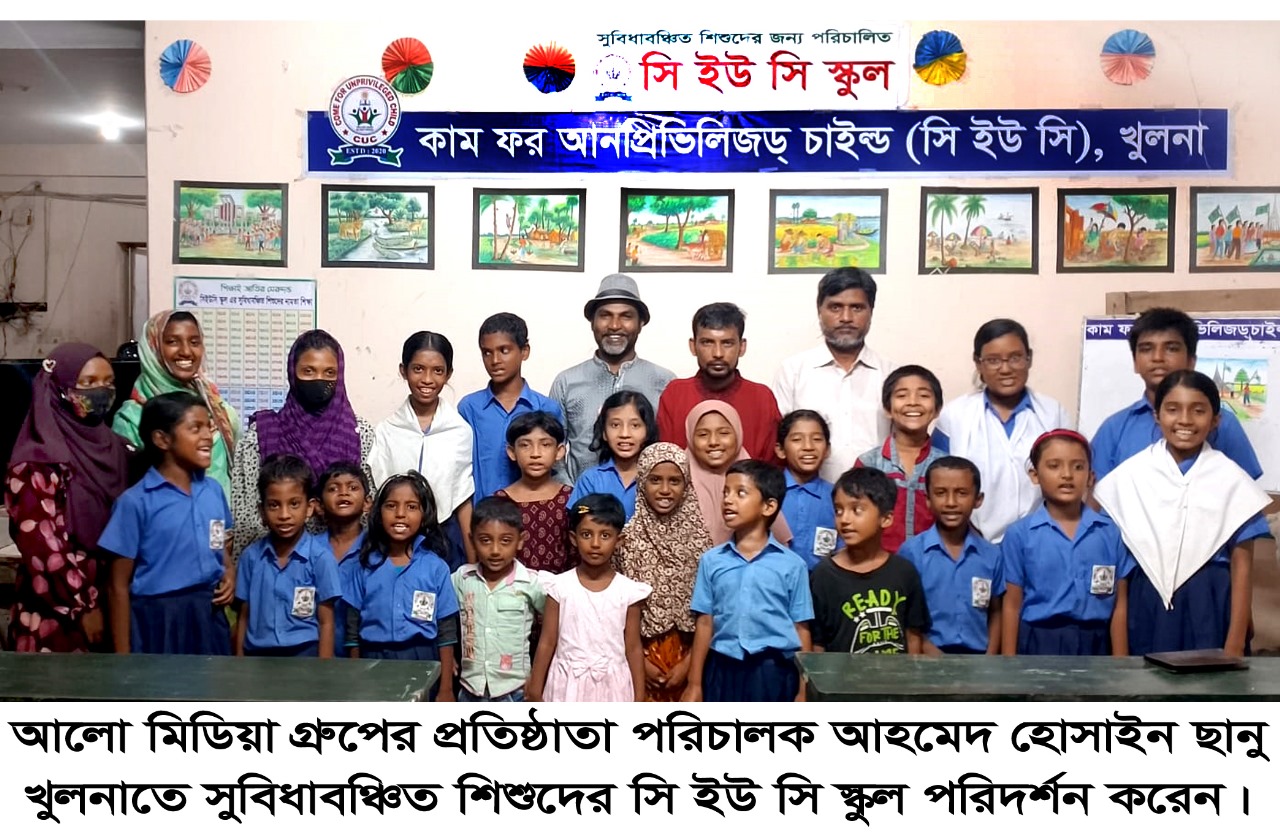 ২৬ অক্টোবর রবিবার বিকাল ৫ ঘটিকায় আলো মিডিয়া গ্রুপের প্রতিষ্ঠাতা পরিচালক, বিশিষ্ট সাংবাদিক ও সংগঠক আহমেদ হোসাইন ছানু ঢাকা থেকে খুলনায় এক সপ্তাহের জন্য সফরে এসেছেন। রবিবার বিকালে চিত্রশিল্পী মিলন বিশ্বাসকে সঙ্গে নিয়ে সুবিধাবঞ্চিত শিশু ও দরিদ্র মানুষের কল্যাণে নিবেদিত সামাজিক সংগঠন কাম ফর আনপ্রিভিলিজড চাইল্ড সিইউসি কর্তৃক পরিচালিত সুবিধা বঞ্চিত শিশুদের সি ইউ সি স্কুল ৬১ সাউথ সেন্ট্রাল রোড খুলনায় পরিদর্শন করেন।এসময় সি ইউ সি সংগঠনের সভাপতি জনাব মোঃ শাহিন হোসেন এবং যুগ্ম সম্পাদক আরিফা ইসলাম খুকুমনি ও দপ্তর সম্পাদক কারিমা আক্তার এবং স্কুলের শিক্ষার্থীরা এ সময় বিশিষ্ট সাংবাদিক আহমেদ হোসাইন ছানুর হাতে সি ইউসি সংগঠনের সভাপতি জনাব মোঃ শাহিন হোসেন প্রতিষ্ঠানের মনোগ্রাম ব্যবহারিত একটি খাতা স্মৃতিস্বরূপ উপহার দেন।
