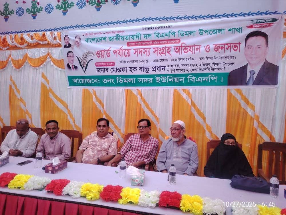 ৩ নং ডিমলা সদর ইউনিয়ন বিএনপি আয়োজন ২৭ অক্টোবর বিকালে ডিমলা উচ্চ বিদ্যালয় মাঠে আহবায়ক,সদস্য সংগ্রহ অভিযান ডিমলা, জেলা বিএনপি যুগ্ম আহবায়ক, মোস্তফা হক বাচ্চু প্রধান এর সভাপতিত্বে, বাংলাদেশ জাতীয়তাবাদী দল বিএনপি ডিমলা উপজেলা শাখার ওয়ার্ড পর্যায়ে সদস্য সংগ্রহ অভিযান ও জনসভায় কর্মসূচির আনুষ্ঠানিক উদ্বোধন মাধ্যমে প্রতিটি ওয়ার্ডে প্রথমে ৪০০জন সদস্য সংগ্রহের কার্যক্রম চালু করা হলো। বেগম খালেদা জিয়ার ভাগ্নে জননেতা ইন্জিনিয়া শাহরিন ইসলাম চৌধুরী তুহিন কে ধানের শীষ মার্কা বিজয়ের লক্ষ্যে ওয়ার্ড পর্যায়ে সদস্য সংগ্রহের জনসভায়। অন্যদের মধ্যে উপস্থিত ছিলেন, জেলা বিএনপির আহ্বায়ক কমিটির উপদেষ্টা অধ্যাপক আলহাজ্ব রইসুল আলম চৌধুরী, সদস্য মুক্তার হোসেন,সদস্য অধ্যক্ষ মানোয়ার হোসেন,সদস্য অধ্যাপিকা সেতারা সুলতানা, সদস্য গোলাম রব্বানী প্রধান, উপজেলা বিএনপির সাবেক সিনিয়র সহ-সভাপতি আরিফ উল ইসলাম লিটন,দশটি ইউনিয়নের সদস্য সংগ্রহ অভিযান কমিটির সদস্যবৃন্দ উপজেলা বিএনপির বিভিন্ন অঙ্গ সংগঠনের নেতাকর্মী, মহিলা নেত্রী সুধী সমাজ উপস্থিত ছিলেন। বক্তারা বলেন সদস্য সংগ্রহ অভিযানে মাধ্যমে দলকে তৃণমূল থেকে শক্তিশালী করে আগামী নির্বাচনে বিজয় লাভ করে যেন সরকার গঠন করতে পারি। বিএনপি বিভেদে নয় গঠনতন্ত্রে বিশ্বাসী দল, বিএনপি চায় বাংলাদেশের মানুষ সুখে শান্তিতে থাকুক,সমৃদ্ধির পথে এগিয়ে যাক, কিন্তু ষড়যন্ত্রকারীরা বিএনপি'র মিথ্যা অপবাদ দিয়ে ফায়দা লুটতে চায় তাদের বিরুদ্ধে সজাগ থাকতে হবে সকল নেতাকর্মীদের।