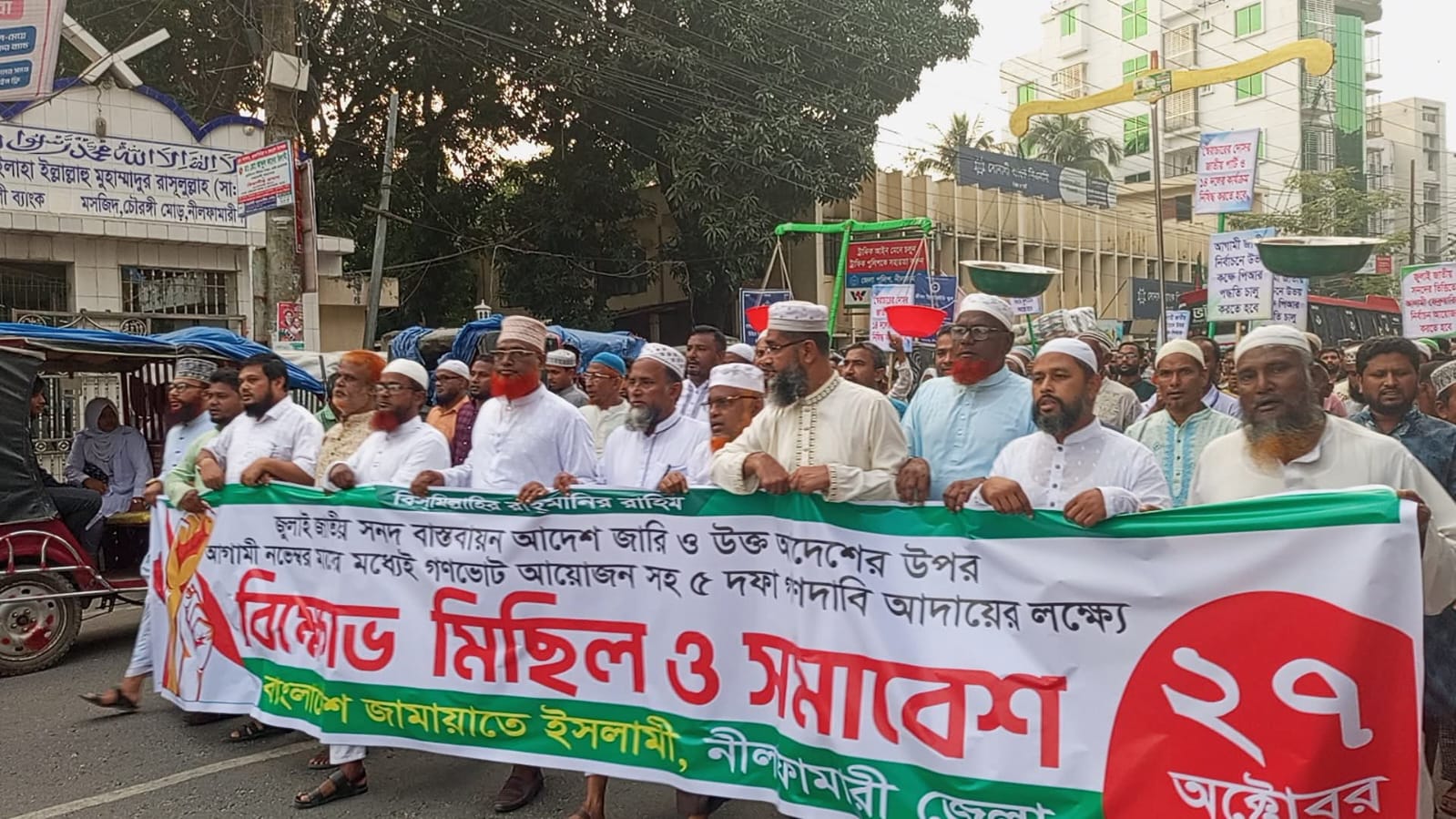 বাংলাদেশ জামায়াতে ইসলামী ঘোষিত কেন্দ্রীয় কর্মসূচির অংশ হিসেবে নীলফামারীতে পাঁচ দফা দাবির সমর্থনে বিক্ষোভ মিছিল অনুষ্ঠিত হয়েছে। সোমবার সকাল থেকে শহরের গুরুত্বপূর্ণ সড়কগুলোতে নেতাকর্মীরা ব্যানার-ফেস্টুন নিয়ে অংশগ্রহণ করেন।