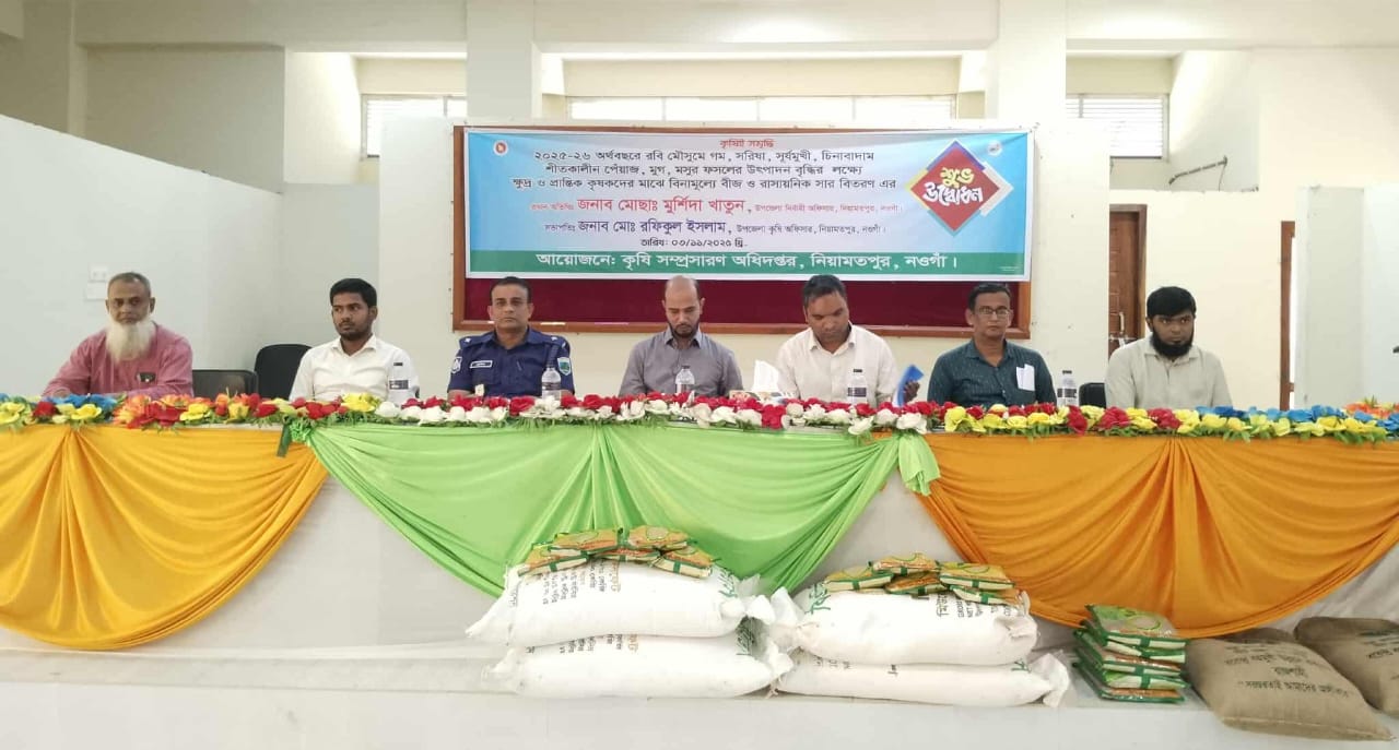 নওগাঁর নিয়ামতপুরে ২০২৫-২৬ অর্থবছরের রবি মৌসুমে কৃষি সম্প্রসারণ অধিদপ্তরের সহযোগিতায় সরিষা, গম, চিনাবাদাম সূর্যমুখী (হাইব্রিড) শীতকালীন পিঁয়াজ, মসুর ও খেসারি উৎপাদন বৃদ্ধির লক্ষ্যে কৃষি প্রণোদনা কর্মসূচির আওতায় ক্ষদ্র ও প্রান্তিক কৃষকদের মাঝে বিনামূল্যে বীজ ও রাসায়নিক সার বিতরণ করা হয়েছে।