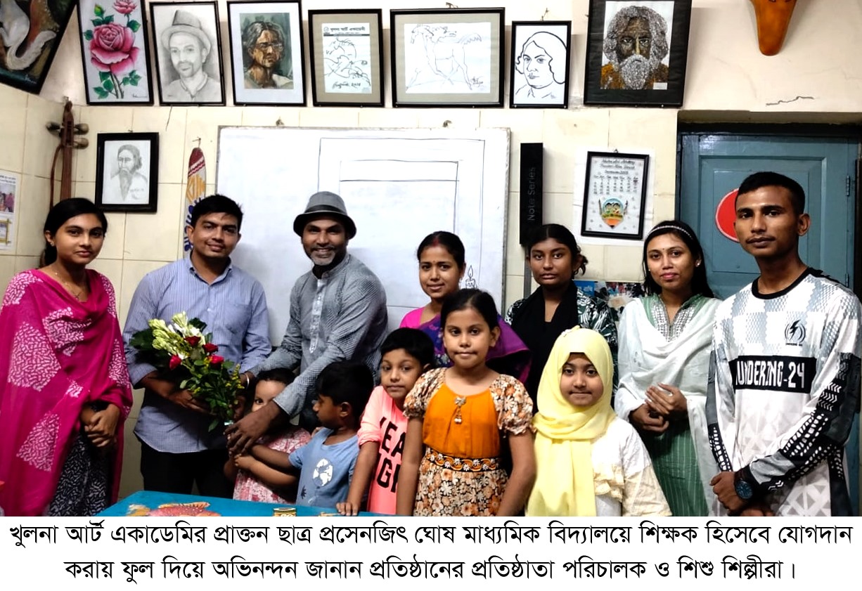 খুলনা আর্ট একাডেমির প্রাক্তন ছাত্র প্রসেনজিৎ ঘোষ শিক্ষা ক্যাডারের ১৮তম নিবন্ধনে খুলনা তিতুমীর শহীদ স্মৃতি মাধ্যমিক বিদ্যালয়ে চারু ও কারুকলা বিভাগের সহকারী শিক্ষক পদে নির্বাচিত হয়েছেন।এই আনন্দঘন মুহূর্তে তিনি তাঁর শিল্পগুরু ও খুলনা আর্ট একাডেমির প্রতিষ্ঠাতা পরিচালক চিত্রশিল্পী মিলন বিশ্বাসকে মিষ্টি খাইয়ে সম্মান জানান।শিক্ষার্থীর এমন সাফল্যে আপ্লুত হয়ে চিত্রশিল্পী মিলন বিশ্বাস বলেন “শিক্ষার্থীর সাফল্যেই একজন শিক্ষকের সাধনা পূর্ণতা পায়। তাদের পথচলা আলোকিত হোক, তারা জাতির সম্পদে পরিণত হবে এটাই আমার বিশ্বাস।২০১০ সাল থেকে খুলনা আর্ট একাডেমি পরিচালনা করে আসছেন চিত্রশিল্পী মিলন বিশ্বাস। ইতিমধ্যে তাঁর একাডেমির ২২৩ জন শিক্ষার্থী দেশের বিভিন্ন বিশ্ববিদ্যালয়ে ভর্তি হওয়ার সুযোগ পেয়েছেন।তিনি জানান,“প্রতিটি শিক্ষার্থীর নাম হয়তো মনে রাখা সম্ভব নয়, তবে তাদের স্মৃতি হৃদয়ে অমলিন।”চারুকলা ভর্তি কোচিংয়ের ২০১৫ সালের পঞ্চম ব্যাচের শিক্ষার্থী প্রসেনজিৎ ঘোষ খুলনা বিশ্ববিদ্যালয়ে ভর্তি হয়ে সাফল্যের সঙ্গে পড়াশোনা শেষ করেন। দীর্ঘ একাগ্র সাধনা ও পরিশ্রমের ফলে অবশেষে শিক্ষা ক্যাডারে সফলতা অর্জন করে তিনি শিক্ষকতা পেশায় যুক্ত হলেন।ফলাফল প্রকাশের পর ৬ই নভেম্বর, প্রসেনজিৎ তাঁর প্রিয় শিক্ষক মিলন বিশ্বাসের কাছে তাঁর ভাইজিকে চারুকলায় এডমিশন দেওয়ার জন্য ভর্তি করতে নিয়ে আসেন। দীর্ঘ বছর পর প্রসেনজিৎ খুলনা আর্ট একাডেমিতে আসে।চাকরির পাওয়ার সংবাদে প্রসেনজিৎ ঘোষ কে খুলনা আর্ট একাডেমির ক্ষুদে শিল্পীরা ফুল দিয়ে তাকে অভিনন্দন জানায়। এ সময় আরো উপস্থিত ছিলেন প্রতিষ্ঠাতা পরিচালক চিত্রশিল্পী মিলন বিশ্বাস সরকারি, পরিচালক শিলা বিশ্বাস, সহকারী শিক্ষিকা শর্মী দেবনাথ, ১৬ তম ব্যাচের শিক্ষার্থী সাগর ফকির, মৌমিতা গোলদার,জিনিয়া ইসলাম, সৃজা চ্যাটার্জি , আফিফা,আনায়া বিনতে অনা, রাফসান এবং ক্ষুদে শিল্পী দুয়া। জানা যায়, খুলনা আর্ট একাডেমির ৯ জন শিক্ষার্থী এবার শিক্ষা ক্যাডারে নির্বাচিত হয়েছেন। একাডেমির আরও অনেক শিক্ষার্থী ইতিমধ্যে চারুকলার শিক্ষক হিসেবে কর্মরত থাকলেও সবাই স্যারের সঙ্গে দেখা করতে পারেননি।নিজের আবেগ প্রকাশ করে চিত্রশিল্পী মিলন বিশ্বাস বলেন“আমি তো শিল্পী হতে এসে শিল্পী হতে পারিনি, তবে নবীন শিল্পীদের পথপ্রদর্শক হতে পেরেছি এটাই আমার সবচেয়ে বড় অর্জন। শিক্ষার্থীর সাফল্যই আমার সাধনার সফলতা।”শেষে তিনি এই প্রতিষ্ঠান থেকে ইতোমধ্যে চাকরিতে নিয়োজিত সকল শিক্ষার্থীকে অভিনন্দন জানান এবং তাদের উজ্জ্বল ভবিষ্যৎ কামনা করেন।