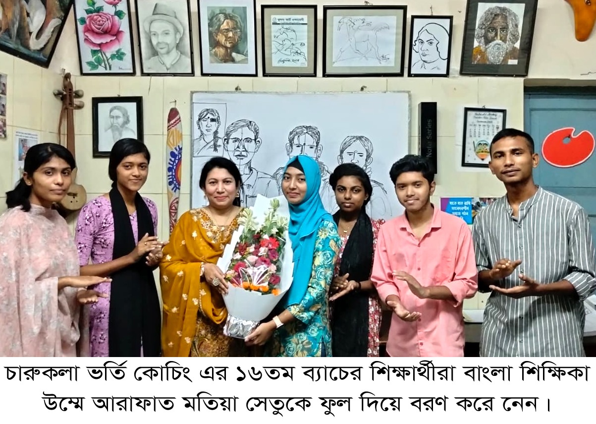 খুলনা আর্ট একাডেমি পরিচালিত চারুকলা ভর্তি কোচিং-এর ১৬তম ব্যাচের শিক্ষার্থীরা তাঁদের বাংলা ভাষার প্রতি শ্রদ্ধা জানিয়ে প্রথম ক্লাসে বাংলা শিক্ষিকা উম্মে আরাফাত মতিয়া সেতু ম্যাডামকে ফুল দিয়ে বরণ করে নেন মোহনা আক্তার বিভা, জয়দ্যূতি সরকার, পূজা শীল, বন্যা বাছাড়,সাগর ফকির ও তরি গাইন। তিনি খুলনা রায়েরমহল কলেজের বাংলা প্রভাষক।২০০৩ সালে প্রতিষ্ঠিত খুলনা আর্ট একাডেমি একটি স্বনামধন্য সাংস্কৃতিক প্রতিষ্ঠান। প্রতিষ্ঠাতা ও পরিচালক চিত্রশিল্পী মিলন বিশ্বাস শিশু শিল্পী গড়ে তোলা এবং চারুকলা বিষয়ে ভর্তি-ইচ্ছুক শিক্ষার্থীদের নিয়ে নিরলসভাবে কাজ করে যাচ্ছেন।২০১০ সাল থেকে একাডেমিতে নিয়মিতভাবে চারুকলা ভর্তি কোচিং কার্যক্রম পরিচালিত হচ্ছে। এই দীর্ঘ যাত্রায় খুলনা আর্ট একাডেমির অসংখ্য শিক্ষার্থী বাংলাদেশের বিভিন্ন বিশ্ববিদ্যালয়, প্রাথমিক শিক্ষক প্রশিক্ষণ ইনস্টিটিউট, মাধ্যমিক বিদ্যালয় এবং ইন্সপেক্টর পদে দায়িত্ব পালন করে গৌরবের সঙ্গে কাজ করছেন। এমনকি দেশের বাইরে অনেক শিক্ষার্থী চারুকলা শিক্ষায় উচ্চতর ডিগ্রি অর্জনের সুযোগও পেয়েছেন।বাংলা ম্যাডাম আরাফাত সেতু ক্লাস শুরু করলে শিক্ষার্থীরা মনোযোগ সহকারে পাঠ গ্রহণ করে। দীর্ঘ সময় ক্লাস শেষে চিত্রশিল্পী মিলন বিশ্বাস শিক্ষার্থীদের কাছে তাদের অনুভূতি জানতে চান। শিক্ষার্থীরা উচ্ছ্বাস প্রকাশ করে বলেন, “এত সুন্দর ক্লাস আমরা আগে কখনো পাইনি; সারাদিনও ম্যাডামের ক্লাস করতে আমাদের ভালো লাগবে।”ম্যাডাম শিক্ষার্থীদের এই আগ্রহ দেখে অত্যন্ত আনন্দিত হন।চিত্রশিল্পী মিলন বিশ্বাস ম্যাডামকে ধন্যবাদ জানিয়ে বলেন, “১৬তম ব্যাচের শিক্ষার্থীরা যে স্বপ্ন ও আশা নিয়ে খুলনা আর্ট একাডেমিতে এসেছে, আমরা সেই স্বপ্ন বাস্তবায়নে সর্বোচ্চ চেষ্টা করব।”