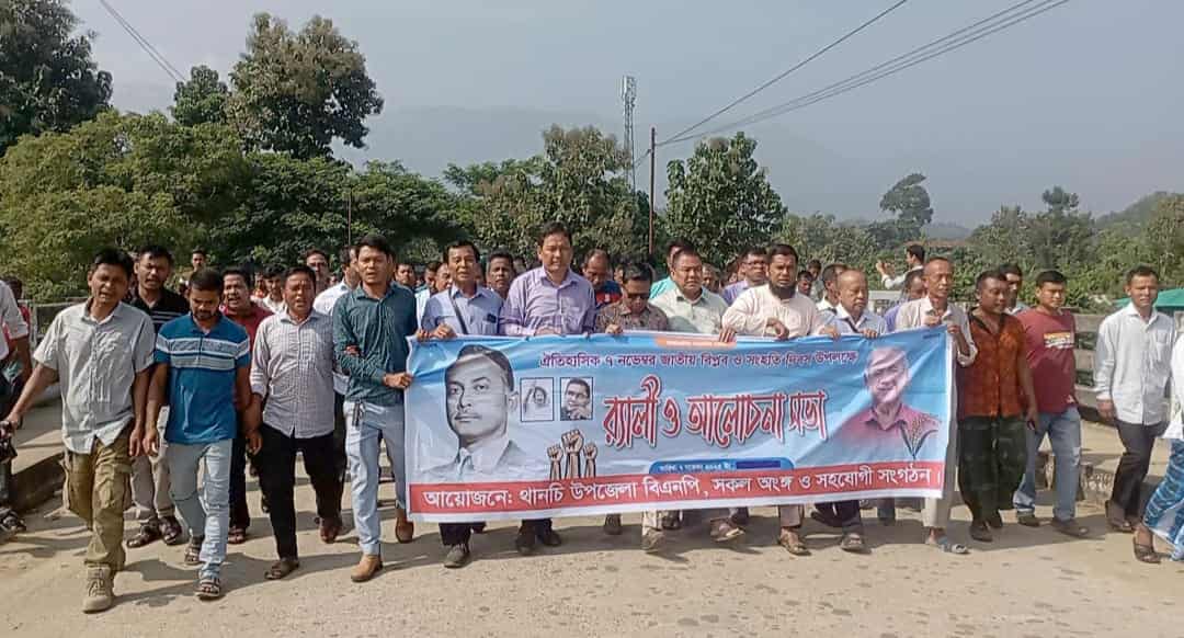 বান্দরবানের থানচিতে জাতীয় বিপ্লব ও সংহতি দিবস উপলক্ষে র্যালী ও আলোচনা সভার আয়োজন করেছে উপজেলা বিএনপি, সকল অংঙ্গ ও সহযোগী সংগঠন। শুক্রবার (৭ নভেম্বর) সকালে অনুষ্ঠিত এ কর্মসূচিতে অংশ নেন দলীয় নেতাকর্মীসহ এলাকার সাধারণ মানুষ।