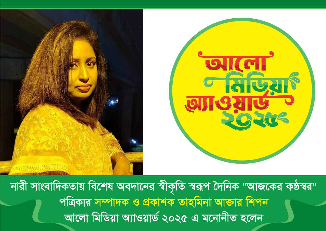 খুলনা থেকে প্রকাশিত দৈনিক "আজকের কন্ঠস্বর" পত্রিকার সম্পাদক ও প্রকাশক তাহমিনা আক্তার শিপন, নারী সাংবাদিকতায় বিশেষ অবদানের জন্য আলো মিডিয়া অ্যাওয়ার্ড ২০২৫ এ মনোনীত হয়েছেন। দীর্ঘকাল ধরে সাহসী ও প্রগতিশীল সাংবাদিকতার মাধ্যমে তিনি সমাজে নারীর ক্ষমতায়ন এবং অধিকার প্রতিষ্ঠায় গুরুত্বপূর্ণ ভূমিকা পালন করেছেন, যা তাকে এই সম্মানজনক স্বীকৃতির দিকে নিয়ে এসেছে।