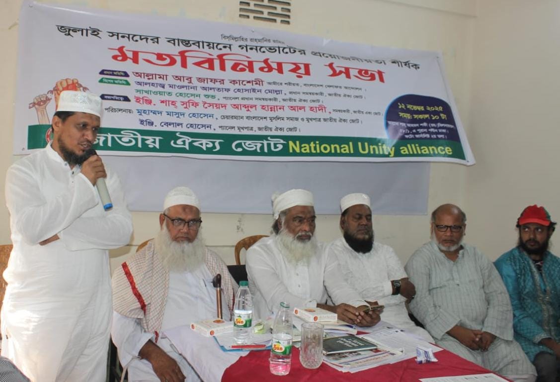 ১২ ই নভেম্বর ২০২৫ জাতীয় ঐক্য জোটের উদ্যোগে আল্লামা আহমেদ শফী মিলনায়তনে জুলাই সনদ এর বাস্তবায়নে গণভোটের প্রয়োজনীয়তা শীর্ষক মতবিনিময় সভায় সভাপতিত্ব করেন জাতীয় ঐক্য জোটের সমন্বয়কারী ইঞ্জিনিয়ার শাহ সুফি সৈয়দ আব্দুল হান্নান আল হাদী। সভা পরিচালনা করেন বাংলাদেশ মুসলিম সমাজের চেয়ারম্যান ও জাতীয় ঐক্য জোটের মুখপাত্র মোহাম্মদ মাসুদ হোসেন।