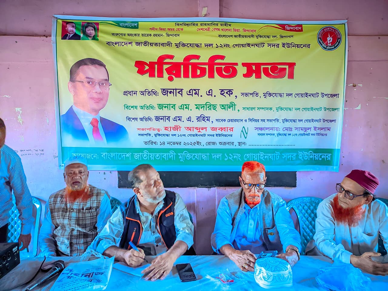 সিলেটের গোয়াইনঘাট উপজেলার ১২ নং গোয়াইনঘাট সদর ইউনিয়নে জাতীয়তাবাদী মুক্তিযোদ্ধা দলের উদ্যোগে পরিচিতি সভা অনুষ্ঠিত হয়েছে। অনুষ্ঠানে প্রধান অতিথি হিসেবে উপস্থিত ছিলেন গোয়াইনঘাট উপজেলা মুক্তিযোদ্ধা দলের সভাপতি এম এ হক।