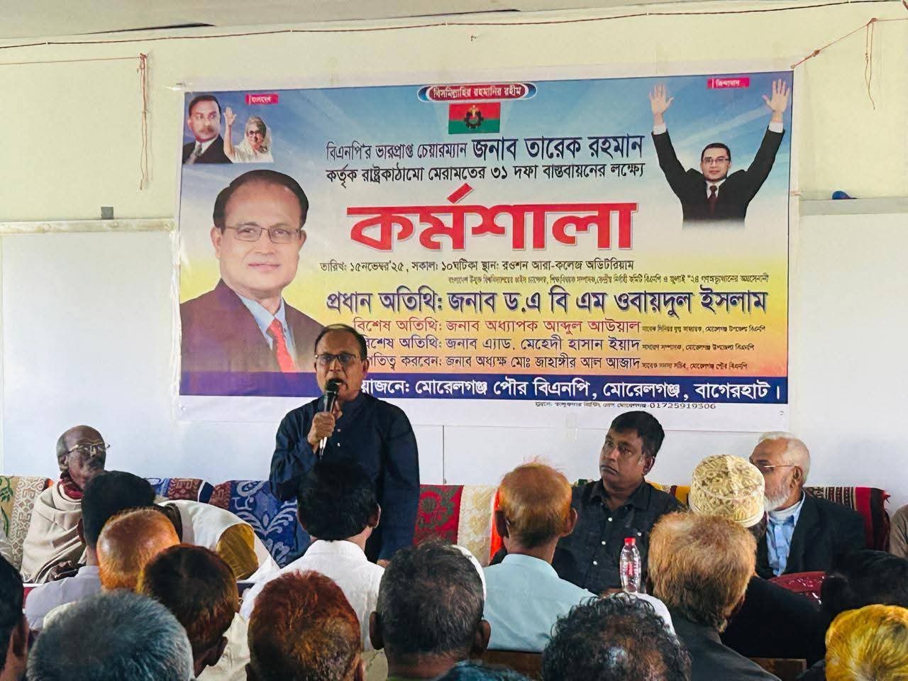 বিএনপি ভারপ্রাপ্ত চেয়ারম্যান তারেক রহমান ঘোষিত “রাষ্ট্রকাঠামো মেরামতের ৩১ দফা” বাস্তবায়নের লক্ষ্যে বাগেরহাটের মোরেলগঞ্জে বিএনপির উদ্যোগে একটি কর্মশালা অনুষ্ঠিত হয়েছে। শনিবার (১৫ নভেম্বর) সকাল ১০টায় মোরেলগঞ্জ পৌর বিএনপির আয়োজনে রওশন আরা কলেজ অডিটরিয়ামে এই কর্মশালার আয়োজন করা হয়।