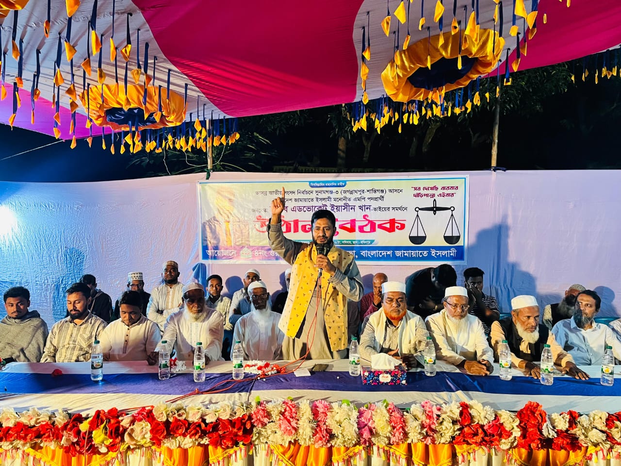 সুনামগঞ্জ-৩ জগন্নাথপুর-শান্তিগঞ্জ আসনে বাংলাদেশ জামায়াতে ইসলামী মনোনীত সংসদ সদস্য পদপ্রার্থী এডভোকেট ইয়াসীন খান এর সমর্থনে শনিবার ( ১৫ নভেম্বর) সন্ধ্যা ৬টায় পৌরসভার ৪ নং ওয়ার্ডে উঠান বৈঠক অনুষ্ঠিত হয়। হবিবপুর গ্রামের বিশিষ্ট মুরব্বি আমরু মিয়ার সভাপতিত্বে ও উপজেলা পেশাজীবি শাখার সভাপতি কবির উদ্দিনের সঞ্চালনায় অনুষ্ঠিত উঠান বৈঠকে বক্তব্য রাখেন জগন্নাথপুর উপজেলা জামায়াতের আমীর মাওলানা লুৎফুর রহমান, নায়বে আমীর মাওলানা দরছ উদ্দিন, উপজেলা সেক্রেটারি মাওলানা আফজাল হোসাইন, পৌর জামায়াতের সভাপতি আ হ ম ওয়ালী উল্লা, পৌরসভার পেশাজীবি শাখার সহ-সভাপতি আশরাফ হোসেন এনাম, ৪নং ওয়ার্ড জামায়াতের কর্মী কাওসার আহমদ, আরফিক আহমেদ প্রমুখ। অনুষ্ঠিত উঠান বৈঠকে ৪নং ওয়ার্ডের বিভিন্ন দল থেকে অর্ধশত মানুষ জামায়াতে ইসলামীতে যোগদান করেন। এসময় জামায়াতে ইসলামী ও ইসলামি ছাত্র শিবির নেতৃবৃন্দ সহ শতাধিক জনসাধারণ উপস্থিত ছিলেন।