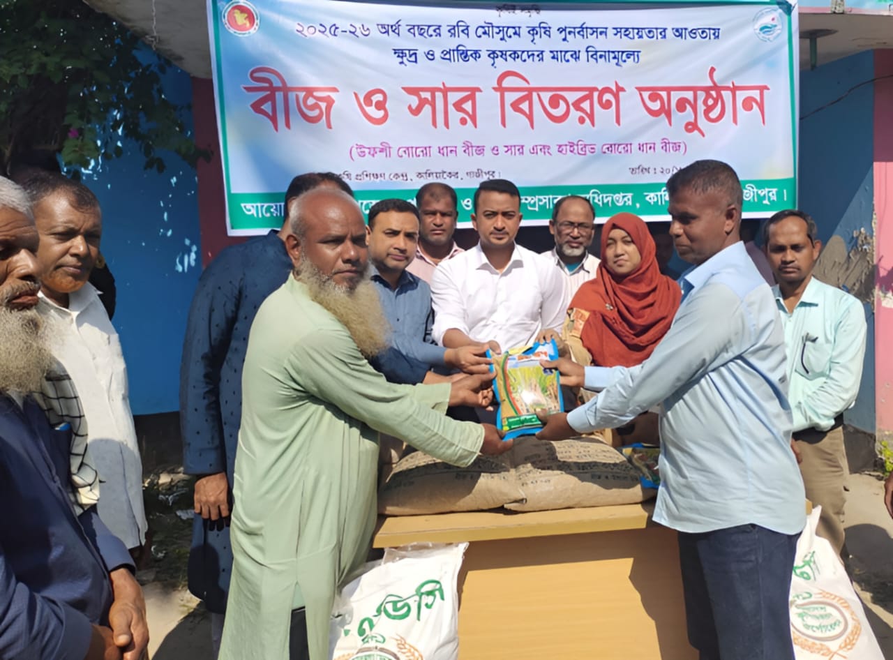 বৃহস্পতিবার সকালে কালিয়াকৈর উপজেলা কৃষি প্রশিক্ষণ কেন্দ্রের সামনে এই প্রণোদনা বিতরণ করা হয়।২০২৫-২৬ অর্থবছরে রবি মৌসুমে কৃষি পূর্ণবাসন সহায়তার আওতায় ক্ষুদ্র ও প্রাপ্তিক কৃষকদের মাঝে বিনামূল্যে বীজ ও সার বিতরণ করা হয়।