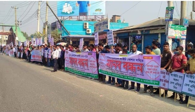 নীলফামারীর উত্তরা রপ্তানি প্রক্রিয়াকরণ অঞ্চলে (ইপিজেড) অনির্দিষ্টকালের জন্য বন্ধ থাকা সনিক বাংলাদেশ লিমিটেড কারখানা দ্রুত চালুর দাবিতে শ্রমিকরা রোববার (২৩ নভেম্বর) মানববন্ধন করেছেন।