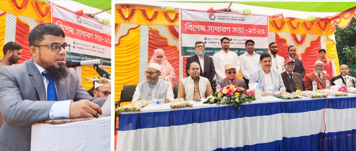 বাংলাদেশ রেড ক্রিসেন্ট সোসাইটি চাঁপাইনবাবগঞ্জ ইউনিটে এক বিশেষ সাধারণ সভার আয়োজন করা হয়েছে।(২২ নভেম্বর) শনিবার সকাল ১০ ঘটিকায় কালেক্টরেট গ্রিন ভিউ উচ্চ বিদ্যালয় মাঠ প্রাঙ্গণে বিশেষ সাধারণ সভা অনুষ্ঠিত হয়। উক্ত অনুষ্ঠানে সভাপতিত্ব করেন, আহবায়ক কমিটির ভাইস-চেয়ারম্যান ও চেম্বার অব কমার্স এন্ড ইন্ডাস্ট্রি সভাপতি আব্দুল ওয়াহেদ।উক্ত বিশেষ সাধারণ সভার বক্তব্য দেন,বাংলাদেশ রেড ক্রিসেন্ট জেলা ইউনিটের নবনির্বাচিত চেয়ারম্যান জেলা প্রশাসক ও জেলা ম্যাজিস্ট্রেট মোঃ শাহাদাত হোসেন মাসুদ। বাংলাদেশ রেড ক্রিসেন্ট চাঁপাইনবাবগঞ্জ ইউনিটের কার্যনির্বাহী কমিটির ২০২৫-২০২৭ দ্বি-বার্ষিক নির্বাচনে নবনির্বাচিতদের নাম প্রকাশ করে আহবায়ক কমিটির নির্বাচন কমিশনার অতিরিক্ত জেলা ম্যাজিস্ট্রেট মোঃ আনিসুর রহমান। কার্যনির্বাহী কমিটির প্রতিটি পদে একাধিক প্রার্থী না থাকায় উক্ত প্রার্থীদের আগামী দুই বছর মেয়াদের জন্য চুড়ান্ত ইউনিট কার্যনির্বাহী কমিটি ঘোষণা করেন। বাংলাদেশ রেড ক্রিসেন্ট চাঁপাইনবাবগঞ্জ ইউনিটে ভাইস- চেয়ারম্যান পদে নির্বাচিত হলেন এ্যাডভোকেট নূরে আলম সিদ্দিকী আসাদ, সেক্রেটারি পদে নির্বাচিত হলেন চাঁপাইনবাবগঞ্জ চেম্বার অফ কমার্স ইন্ডাস্ট্রি সহ-সভাপতি মোঃ খাইরুল ইসলাম,উক্ত নবনির্বাচিত ৫ জন নির্বাহী সদস্য পদে নির্বাচিত হলেন, মফিজ উদ্দিন, রোজিনা সুলতানা, আব্দুল রাজ্জাক, তোহুরুল ইসলাম সোহেল ও মানিক রায়হান। এছাড়াও আরোও উপস্থিত ছিলেন, আইনজীবি সমিতির সভাপতি এ্যাডভোকেট মহাম্মদ ইসাহাক, ডাঃ ময়েজ উদ্দিন, সিনিয়র সাংবাদিক গোলাম মোস্তফা মন্টু প্রমুখ।