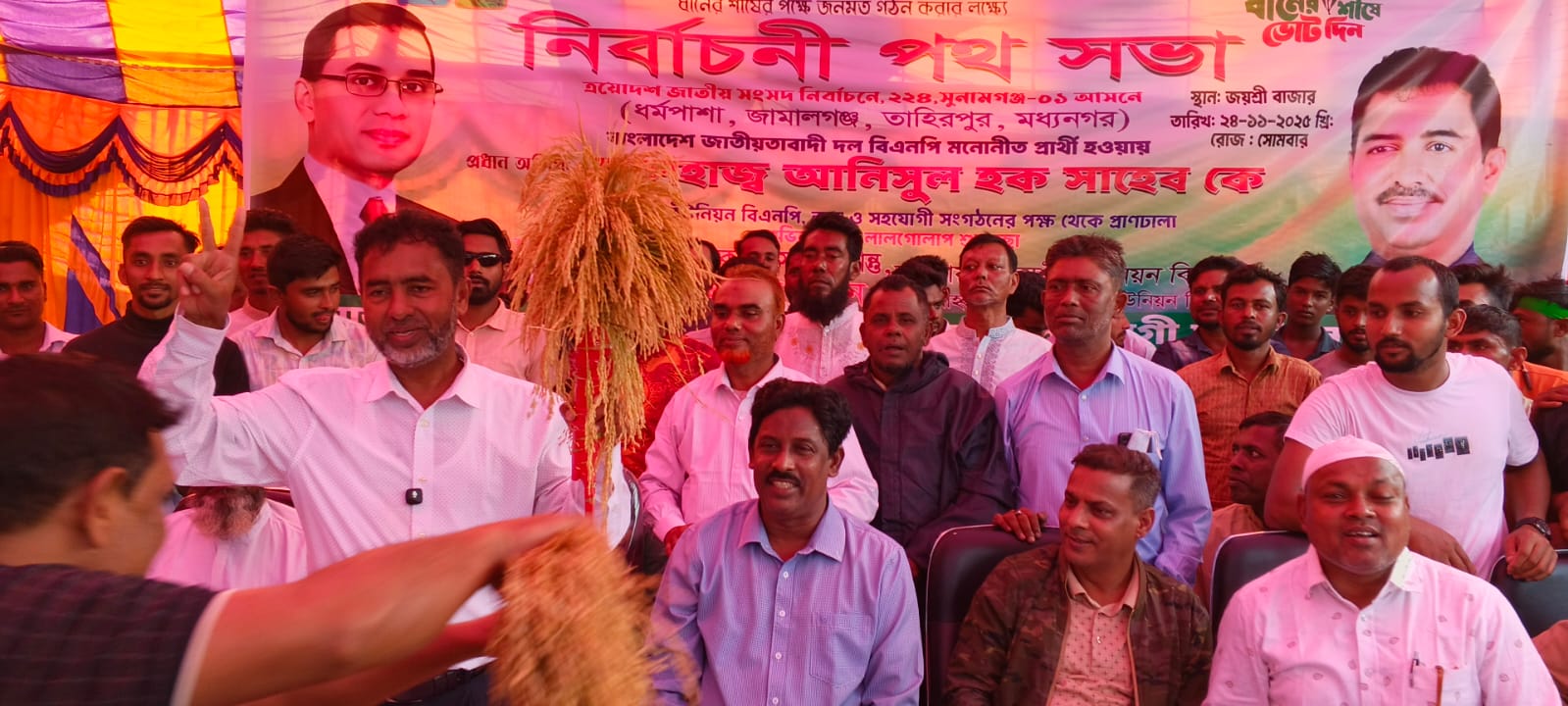 আগামী রাষ্ট্রগঠনে বিএনপির ভারপ্রাপ্ত চেয়ারম্যান তারেক রহমান ঘোষিত জাতির মুক্তির সনদ ৩১ দফা বাস্তবায়নে পথ সভায় আনিসুল হক বলেন, বিএনপি ধানের শীষকে বিজয়ী করতে হবে। তিনি আরও বলেন, স্বাস্থ্য, শিক্ষা ও যোগাযোগ ব্যবস্থা উন্নয়ন করা হবে, হাওরের উড়াল সেতু নির্মাণ হবে, বিএনপি ক্ষমতায় গেলে ১কোটি মানুষের কর্মসংস্থান সৃষ্টি হবে । ত্রয়োদশ জাতীয় সংসদ নির্বাচনে ২২৪ সুনামগঞ্জ-১ আসনে বাংলাদেশ জাতীয়তাবাদী দল বিএনপির মনোনীত প্রার্থী বাংলাদেশ জাতীয়তাবাদী কৃষক দলের কেন্দ্রীয় নির্বাহী কমিটির সহ সাধারণ সম্পাদক ও সুনামগঞ্জ জেলা বিএনপির আহবায়ক কমিটির সদস্য, জননেতা আলহাজ্ব আনিসুল হকের নির্বচনী পথসভা অনুষ্টিত হয়েছে। সোমবার (২৪ নভেম্বর) বিকাল ৩ ঘটিকায় ধর্মপাশা উপজেলার জয়শ্রী বাজারে জয়শ্রী ইউনিয়ন বিএনপির উদ্যোগে পথসভা অনুষ্টিত হয়। সুনামগঞ্জ-১ আসনে বাংলাদেশ জাতীয়তাবাদী দল বিএনপির মনোনীত প্রার্থী আনিসুল হকের নির্বাচনী পথসভায় সভাপতিত্ব করেন জয়শ্রী ইউনিয়ন বিএনপির আহবায়ক তরিকুল ইসলাম শান্তুর সভাপতিত্বে ও সদস্য মোঃ জালাল উদ্দিন এর সঞ্চালনায়। প্রধান অতিথি বিএনপির মনোনীত প্রার্থী আনিসুল হক।