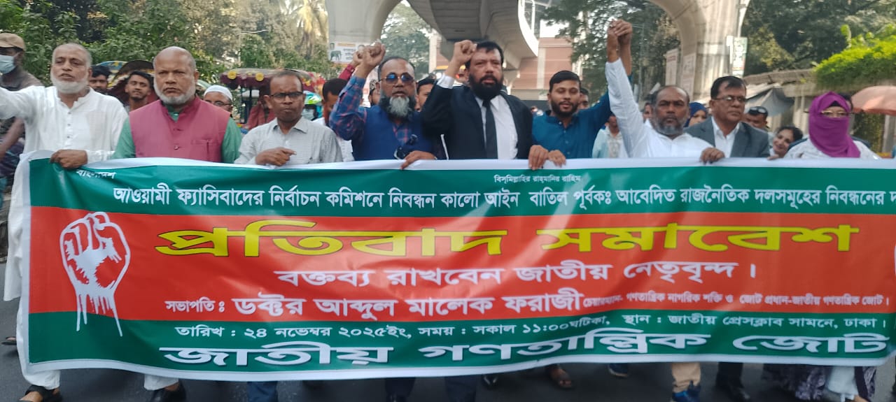 নিবন্ধন বঞ্চিত শতাধিক রাজনৈতিক দলের নিবন্ধনের দাবিতে ২৪ নভেম্বর ২০২৫, সোমবার বেলা ১১টা জাতীয় প্রেসক্লাব প্রাঙ্গণে প্রতিবাদ সমাবেশ অনুষ্ঠিত হয়। জাতীয় গণতান্ত্রিক জোট আয়োজিত সমাবেশে সভাপতিত্ব করেন জোট প্রধান জননেতা ড. আব্দুল মালেক ফরাজী।