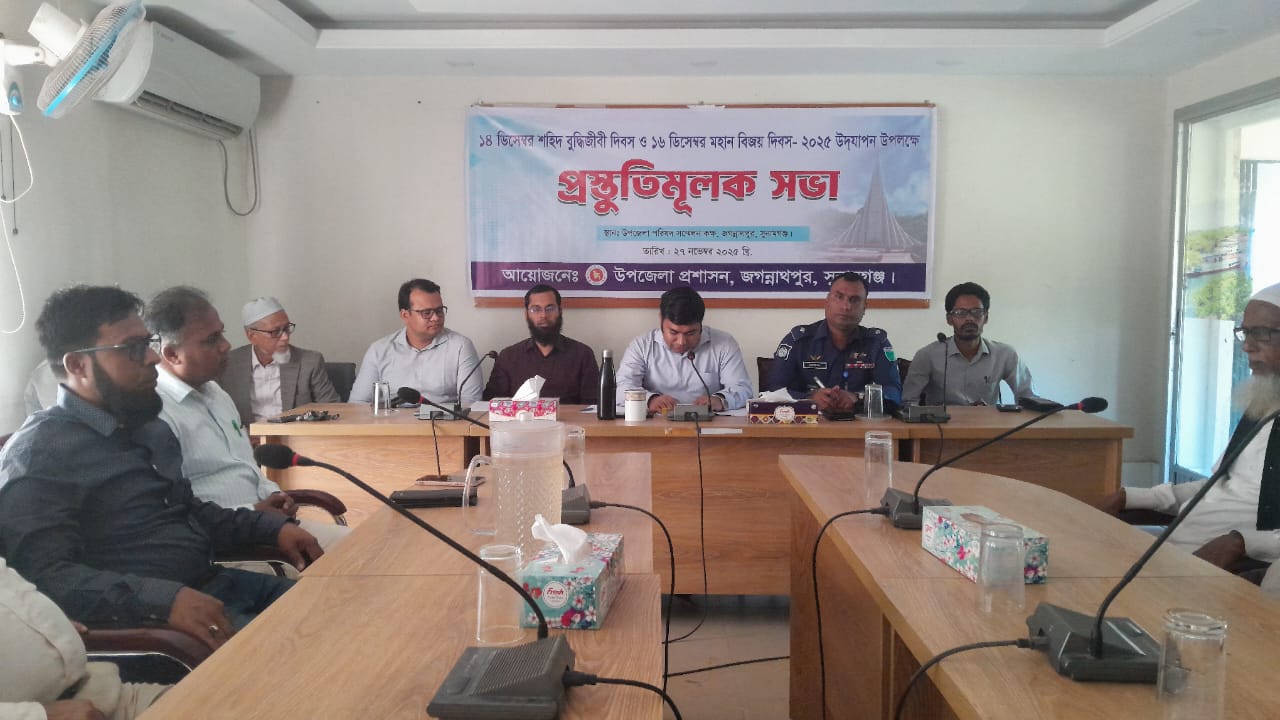 ১৪ ই ডিসেম্বর শহীদ বুদ্ধিজীবী দিবস ও ১৬ ই ডিসেম্বর মহান বিজয় দিবস-২০২৫ ই উদযাপন এর লক্ষে সুনামগঞ্জের জগন্নাথপুর উপজেলা প্রশাসনের আয়োজনে ২৭ শে নভেম্বর রোজ বৃহস্পতিবার সকালে উপজেলা পরিষদ এর হলরুমে জগন্নাথপুর উপজেলা নির্বাহী কর্মকর্তা মোঃ বরকত উল্লাহর সভাপতিত্বে প্রস্তুতি মূলক সভা অনুষ্ঠিত হয়েছে।