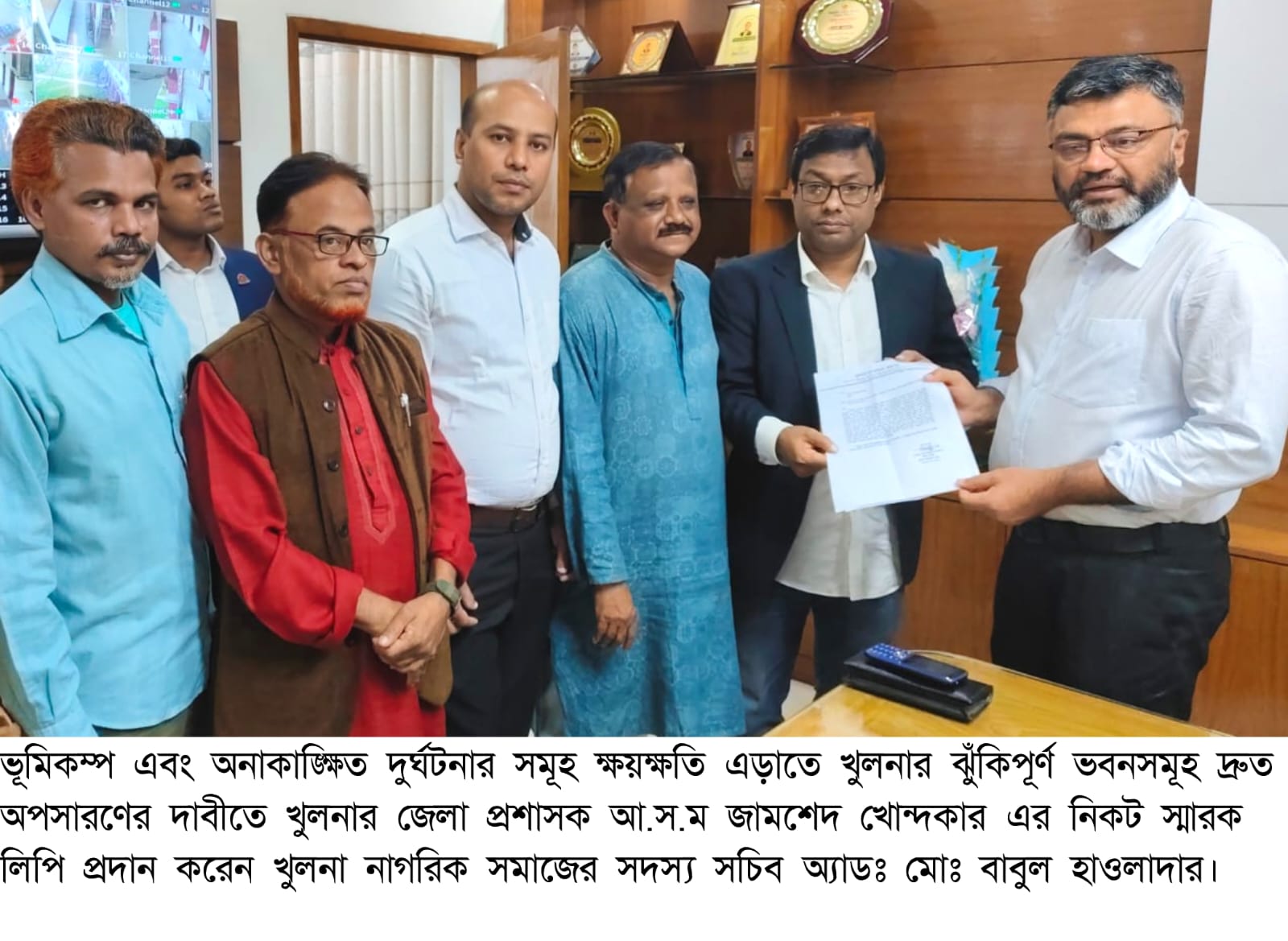 ভূমিকম্প এবং অনাকাঙ্খিত দূর্ঘটনার ক্ষয়ক্ষতি এড়াতে খুলনার ঝঁকিপূর্ণ ভবনসমূহ অপসারণের দাবীতে খুলনা নাগরিক সমাজের উদ্যোগে খুলনার জেলা প্রশাসক আ স ম জামশেদ খোন্দকার এর নিকট গতকাল বৃহস্পতিবার বিকেলে স্মারকলিপি প্রদান করা হয়। এতে উল্লেখ করা হয়, বিশেষজ্ঞদের মতে বাংলাদেশ ভূমিকম্প ঝুঁকিপূর্ণ অঞ্চল। সম্প্রতি ঘটে যাওয়া দেশব্যাপী ৫.৭ মাত্রার ভূকিম্পে খুলনার উপর প্রভাবও ছিল আশংকাজনক। অনেক নাজুক ভবন ও দেয়াল হেলে, ধ্বসে পড়েছে বিভিন্ন স্থানে। ২০০৪ সালে খুলনা সিটি কর্পোরেশন কর্তৃপক্ষ জেলা প্রশাসন এবং কেডিএ’র সাথে সমন্বয় করে ৪৮টি ঝুঁকিপূর্ণ ভবনের তালিকা করে তা অপসারণের সিদ্ধান্ত নেয়। পুনরায় ২০১০ সালে উক্ত ভবনগুলো ভেঙে ফেলার সিদ্ধান্ত গৃহীত হয়। সরকারি তালিকা অনুযায়ী খুলনায় ঝুঁকিপূর্ণ ভবনের সংখ্যা ৪৮ টি হলেও সময়ের ব্যবধানে বিভিন্ন জরিপমতে বর্তমানে এর সংখ্যা ১৫০ এর অধিক এবং অধিকাংশ ভবন মহানগরীর বড় বাজার এলাকায়। জনাকীর্ণ এলাকায় উক্ত ঝুঁকিপূর্ণ ভবন এবং এর আশপাশে যেভাবে দোকানপাট, গোডাউন ও ব্যবসা প্রতিষ্ঠান গড়ে উঠেছে এবং জনবসতি রয়েছে, অপ্রত্যাশিত যে কোন দূর্ঘটনায় বড় ধরণের প্রাণহানির আশংকা বিদ্যমান। একটু বেশি মাত্রার ভূমিকম্প হলে ভবন ধ্বসে আশংকাজনক প্রাণহানী ও মানবিক বিপর্যয়ের সমূহ আশংকা রয়েছে। এমতাবস্থায় জনস্বার্থে দ্রুত সময়ের মধ্যে ঝুঁকিপূর্ণ ভবন সমূহ অপসারণের কার্যকর পদক্ষেপ গ্রহণ অতিব জরুরী। জেলা প্রশাসকের কার্যালয়ে খুলনা নাগরিক সমাজের সদস্য সচিব অ্যাডঃ মোঃ বাবুল হাওলাদার স্বাক্ষরিত স্মারকলিপি প্রদানকালে অন্যান্যের মধ্যে উপস্থিত ছিলেন খুলনা নাগরিক সমাজের সদস্য সচিব অ্যাডঃ মোঃ বাবুল হাওলাদার, সংগঠনের সদস্য যথাক্রমে বৃহত্তর খুলনা উন্নয়ন সংগ্রাম সমন্বয় কমিটির সহ-সভাপতি মিজানুর রহমান বাবু, আইন ও অধিকার বাস্তবায়ন ফোরামের খুলনা বিভাগীয় সভাপতি এস এম দেলোয়ার হোসেন, মানবাধিকার সংগঠক জামাল মোড়ল, নাগরিক আইন পরিষদ খুলনার ইন্সট্রাক্টর এ্যাড. মেহেদী হাসান, কবি মোঃ রহমত আলী, ইমরান হোসেন, হাফিজুর রহমান, মোস্তফা হাসান প্রমুখ। মত বিনিময় সভায় খুলনার আইন-শৃঙ্খলা পরিস্থিতি সহ বিভিন্ন অসংগতি স্থান পায়। এসময়ে জেলা প্রশাসক সমস্যা সমাধানে তাঁর অবস্থান থেকে সম্ভাব্য প্রয়োজনীয় ব্যবস্থা গ্রহণের আশ্ব^াস প্রদান করেন। সৌহার্দ্যপূর্ণ এ মতবিনিময় সভায় নাগরিক নেতৃবৃন্দ জেলা প্রশাসকের নিকট থেকে সমূহ সমস্যার সমাধানে আন্তরিক উদ্যোগ প্রত্যাশা করেন।