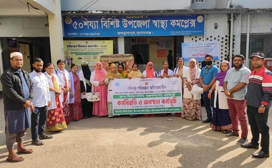 উপজেলা পরিবার পরিকল্পনা কার্যালয়ে কর্মরত পরিবার কল্যাণ পরিদর্শিকা (FWV), পরিবার কল্যাণ সহকারী (FWA) ও পরিবার পরিকল্পনা পরিদর্শক (FPI)–গণ ন্যায্য দাবি বাস্তবায়নে একযোগে অংশ নেন। বক্তারা বলেন, দীর্ঘদিন ধরে ঝুলে থাকা নিয়োগবিধি-২০২৪ দ্রুত কার্যকর না হওয়ায় মাঠকর্মীদের মাঝে চরম হতাশা সৃষ্টি হয়েছে। তারা জানান, নীতিমালা বাস্তবায়ন হলে কর্মপরিবেশ আরও সুসংগঠিত হবে এবং সেবা কার্যক্রম হবে আরও গতিশীল।