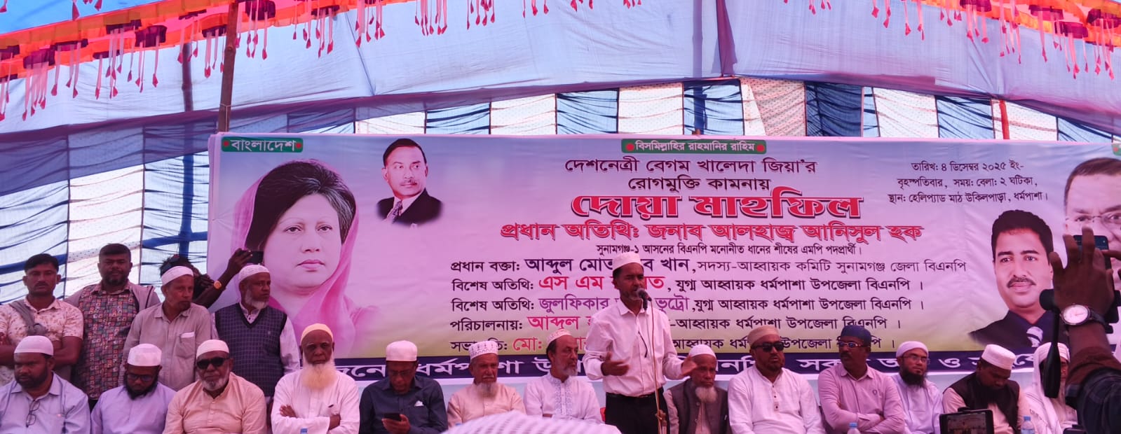 বাংলাদেশ জাতীয়তাবাদী দল বিএনপির চেয়ারপার্সন ও সাবেক তিন বারের প্রধানমন্ত্রী বেগম খালেদা জিয়ার দ্রুত রোগমুক্তি কামনায় সুনামগঞ্জ-১ আসনের বিএনপি মনোনীত প্রার্থী ও কেন্দ্রীয় কৃষকদলের সহ-সাধারণ সম্পাদক আনিসুল হকের উদ্যোগে কোরআন তেলাওয়াত, দোয়া ও মিলাদ মাহফিল অনুষ্ঠিত হয়েছে।