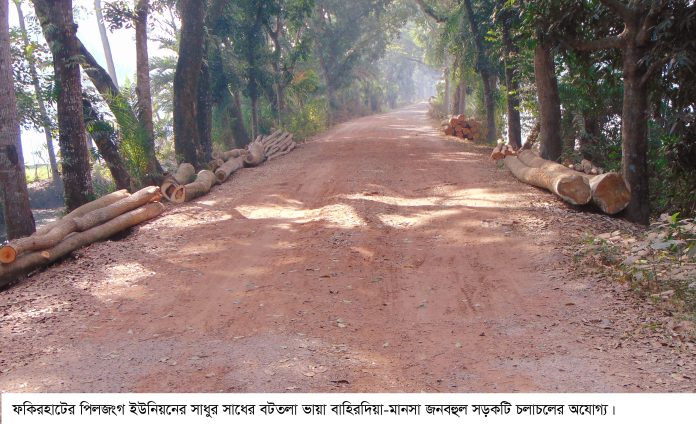 বাগেরহাটের ফকিরহাটের পিলজংগ ইউনিয়নের সাধুর সাধের বটতলা ভায়া বাহিরদিয়া মানসা বাজার জনবহুল একমাত্র সড়কটি এখন চলাচলের অযোগ্য হয়ে পড়েছে। সড়কটির অধিকাংশ স্থানে পিচের কার্পেটিং উঠে বড়বড় গর্তের সৃষ্টি হয়ে তা এখন চলাচলে বাঁধা হয়ে দাড়িয়েছে। বছরের পর বছর উপজেলাবাসি জনবহুল এই গুরুত্বপূর্ণ সড়কটি মেরামত বা সংস্কার করার জন্য স্থানীয় সরকার প্রকৌশলী অফিদপ্তরের উর্দ্ধতন কর্মকর্তাদের হস্তক্ষেপ কামনা করলেও তা এখনও মেরামত করা হয়নী। যে কারনে বাহিরদিয়া-মানসা, নলধা-মৌভোগ, ফকিরহাট সদর, মুলঘর, রুপসার টিএস বাহিরদিয়া, কাজদিয়া, আলাইপুর, পালেরহাট ও আজগড়াসহ বিভিন্ন এলাকার হাজার হাজার জনসাধারনকে পোহাতে হচ্ছে সীমাহিন দুর্ভোগ। আতিদ্রæত সাধুর সাধের বটতলা, বৈলতলী, গাবখালী ভায়া বাহিরদিয়া মানসা বাজার সড়কটি সংস্কারের জন্য স্থানীয় এলাকাবাসি উর্দ্ধতন কর্মকর্তাদের কাছে জোর দাবী জানিয়েছেন।