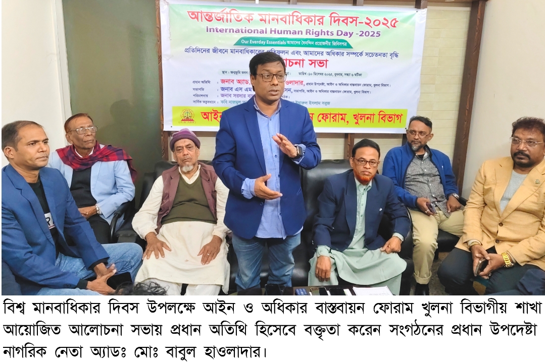 বিশ্ব মানবাধিকার দিবস উপলক্ষে আইন ও অধিকার বাস্তবায়ন ফোরাম, খুলনা বিভাগীয় শাখার উদ্যোগে এক আলোচনা সভা অদ্য বুধবার সন্ধ্য ৬.০০ ঘটিকায় সংগঠনের অস্থায়ী কার্যালয়ে সংগঠনের সভাপতি এস এম দেলোয়ার হোসেন এর সভাপতিত্বে অনুষ্ঠিত হয়। সভায় প্রধান অতিথি হিসেবে উপস্থিত ছিলেন সংগঠনের প্রধান উপদেষ্টা বিশিষ্ট নাগরিক নেতা পরিবেশবিদ খুলনা নাগরিক সমাজের সদস্য সচিব অ্যাডঃ মোঃ বাবুল হাওলাদার। সংগঠনের সাধারণ সম্পাদক সরদার বাদশার সঞ্চালনায় অন্যান্যের মধ্যে উপস্থিত ছিলেন ও বক্তব্য রাখেন কবি সৈয়দ আলী হাকিম, এস এম মনোয়ার হোসেন লাভলু, অধ্যাপক স ম শরিফুল ইসলাম, খুলনা নাগরিক আইন পরিষদের ইন্সট্রাক্টর অ্যাডঃ মেহেদী হাসান, সংগঠনের নেতা কবি নাজমুল তারেক তুষার, মোঃ ইয়ারুল ইসলাম সবুজ, আন্তর্জাাতিক মানবাধিকার সাংবাদিক সংস্থার মোঃ শাহিন হাওলাদার, সংগঠনের সদস্য যথাক্রমে মোঃ মশিয়ার রহমান টুকু, অ্যাডঃ কিংকর রাহা, মোঃ শরিফুল ইসলাম, আরিফ ইসলাম মনি খান, কবি কামরুল হাসান মৃধা, ডাঃ মোঃ রেজাউল ইসলাম, মোঃ শামসুল আলম, মোঃ মেহেদী হাসান রুমী, মোঃ আশরাফুল আলম, এস কে রানা আহমেদ, রুমানা আফরিন প্রমুখ।