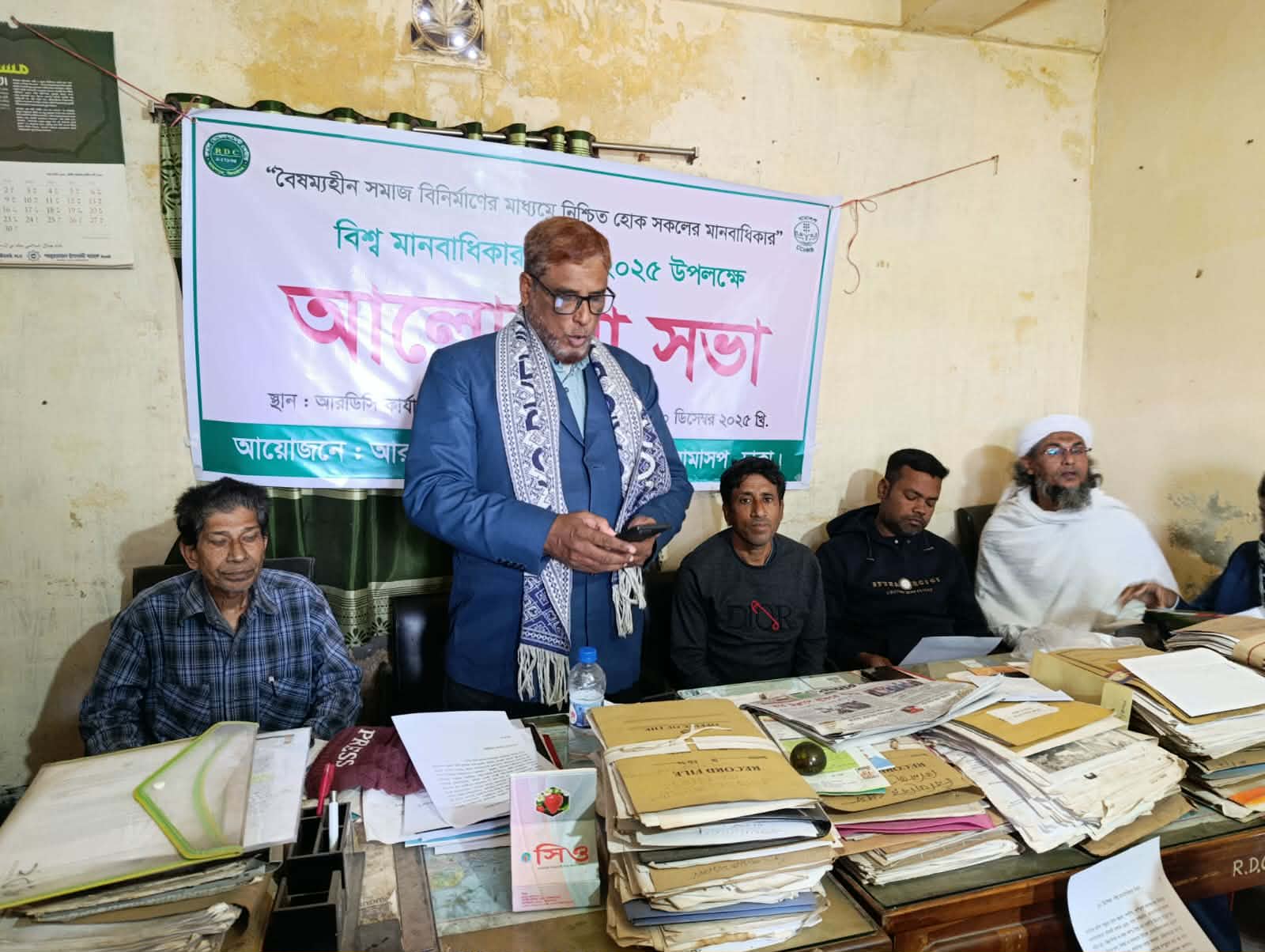 বুধবার সকালে আরডিসি কার্যালয়ে আরডিসির নির্বাহী প্রধান মোঃ আব্দুর রহমানের সভাপত্বিতে অনুষ্ঠিত সভায় বক্তব্য রাখেন মহেশপুর প্রেসক্লাবের সাধারণ সম্পাদক শেখ এনামুল হক দুলু, সিনিয়র সহ-সভাপতি বারর আলী বাবু,সাংগঠনিক সম্পাদক পলাশ রহমান, ব্যবসায়ী শামীম আহম্মেদ,আবুল কাসেম, মাহমুদুল হাসান মিলন,ইশারত আলী। অনুষ্ঠানে আরো উপস্থিত ছিলেন,আরডিসি‘র প্রোগ্রাম অফিসার মোঃ ওসমান গণি,সমাজসেবক মোঃ নাজমুল হোসেন,হাসান আলী,রজমান আলী, লিটন মিয়া,তরিকুল ইসলাম,রনি আহম্মেদ,আতিউর রহমান, মেহেদী হাসান সিরাজী প্রমুখ। সভায় বক্তারা বিশ্ব মানবাধিকার দিবসের বিষয়বস্তু নিয়ে বিস্তারিত আলোচনা করেন এবং যাতে মানুষের দ্বারা মানবাধিকার লঙ্ঘন না হয় আর বিশ্ব মানবাধিকার বজায় থাকার আশা সকলে।