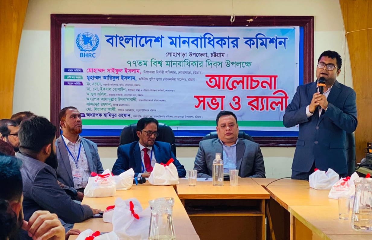 বাংলাদেশ মানবাধিকার কমিশন লোহাগাড়া উপজেলার সভাপতি অধ্যাপক হামিদুর রহমান এর সভাপতিত্বে অনুষ্ঠিত অনুষ্ঠানে প্রধান অতিথি হিসেবে উপস্থিত ছিলেন লোহাগড়া উপজেলা সহকারী কমিশনার (ভুমি) মং এছেন।