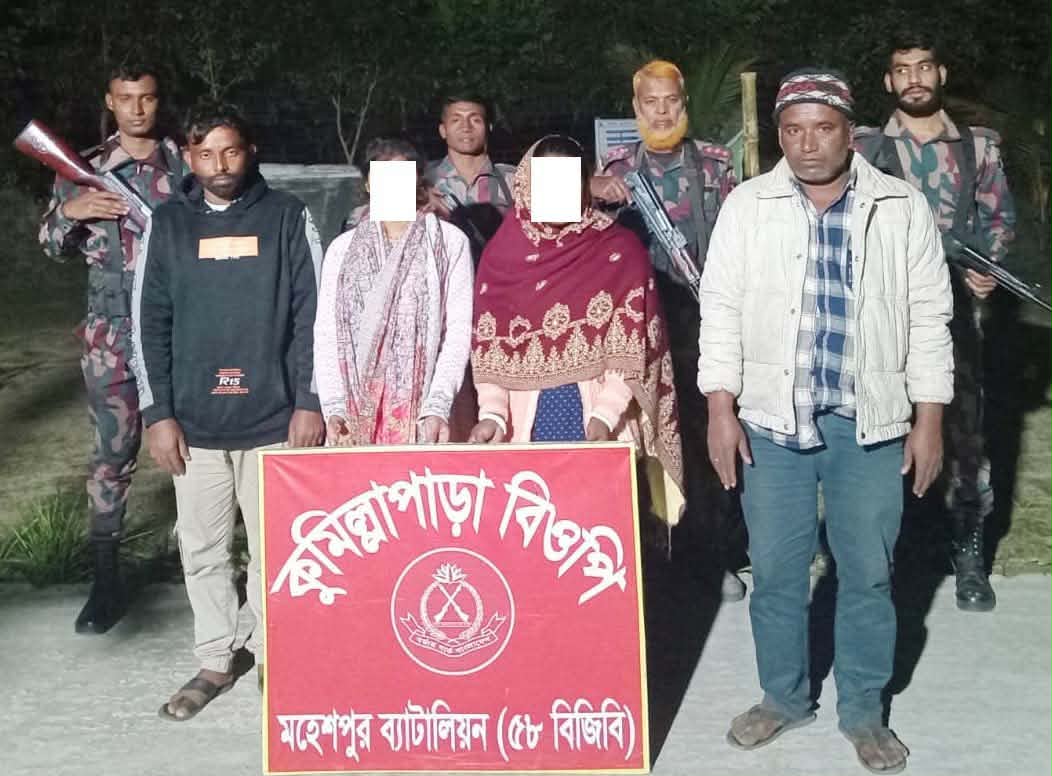 গত ১০ ডিসেম্বর ২০২৫ তারিখ আনুমানিক সন্ধ্যা ৭-১০ ঘটিকায় মহেশপুর ব্যাটালিয়ন (৫৮ বিজিবি) এর অধীনস্থ কুমিল্লপাড়া বিওপি'র দায়িত্বপূর্ণ এলাকার সীমান্ত পিলার-৬০/৫২-আর হতে আনুমানিক ১৫০ গজ বাংলাদেশের অভ্যন্তরে কুমিল্লাপাড়া গ্রামের মোঃ হাসানের এর আম বাগানের মধ্যে হতে হাবিলদার মোঃ আব্বাস আলী এর নেতৃত্বে নিয়মিত টহল পরিচালনা করে অবৈধভাবে বাংলাদেশ হতে ভারতে গমনকালে ০৪ জন (পুরুষ-০২, ১। বুদ্ধি বৈরাগী (৩৫), পিতা-ফুলচাঁদ বৈরাগী, গ্রাম-বৈকুণ্ঠপুর, ডাক-কলাবাড়ী, থানা-কোটালিপাড়া এবং জেলা-গোপালগঞ্জ, ২। রবীন মজুমদার (৪৫), পিতা-মৃত দুঃধীরাম মজুমদার, গ্রাম-বৈকুণ্ঠপুর, ডাক-কলাবাড়ী, থানা-কোটালিপাড়া এবং জেলা-গোপালগঞ্জ, এবং নারী-০২) বাংলাদেশী নাগরিক আটক করা হয়। আটককৃতদেরকে মহেশপুর থানায় হস্তান্তর করা হয়েছে।