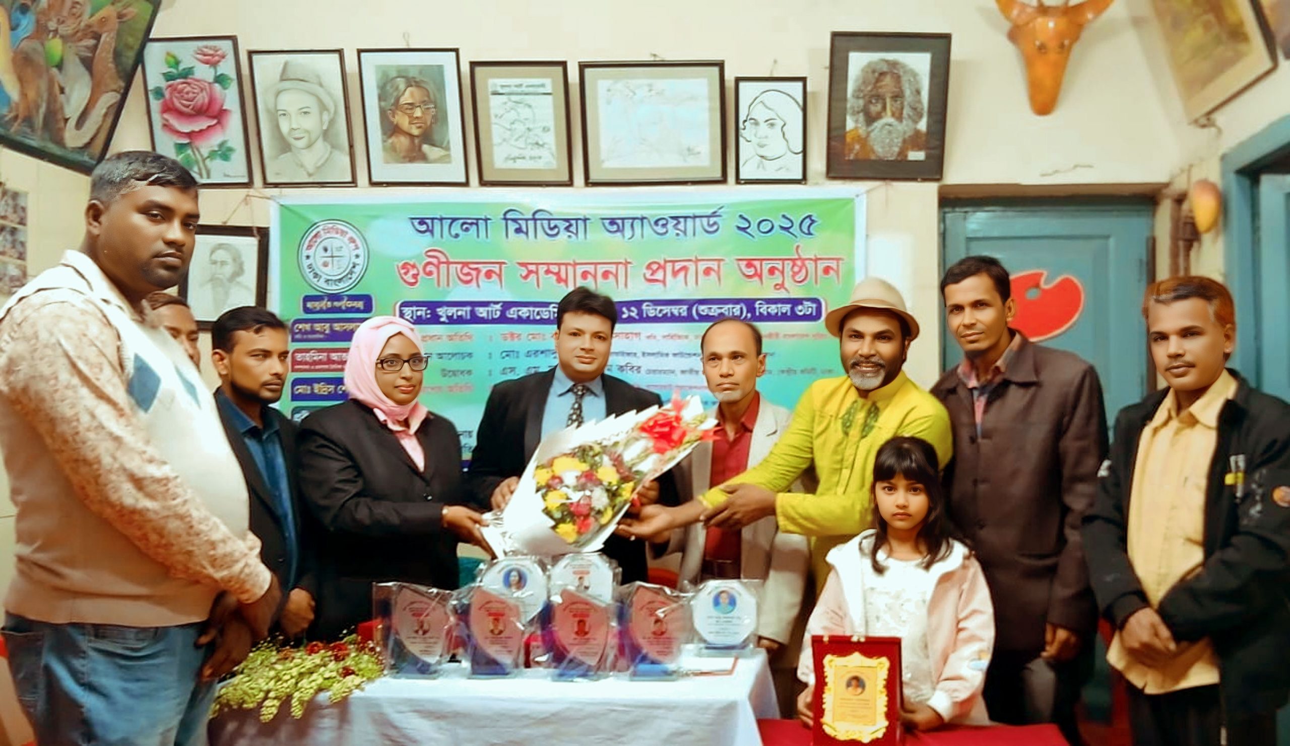 খুলনার শান্ত ও সৃজনশীল সাংস্কৃতিক অঙ্গন শুক্রবার বিকেলে হয়ে ওঠে মুখর ও প্রাণবন্ত। শহরের প্রাণকেন্দ্রে অবস্থিত খুলনা আর্ট একাডেমি রূপ নেয় এক ব্যতিক্রমী সম্মাননা মঞ্চে, যেখানে সাংবাদিকতা, শিল্প, সাহিত্য ও সমাজসেবার সঙ্গে যুক্ত গুণীজনদের সম্মান জানানো হয় “আলো মিডিয়া অ্যাওয়ার্ড ২০২৫” অনুষ্ঠানে।১২ ডিসেম্বর (শুক্রবার) বিকাল ৩টায় অনুষ্ঠিত এই আয়োজনে সাংস্কৃতিক কর্মী, সাংবাদিক, কবি, শিক্ষক, শিশুশিল্পী ও সমাজসেবীরা একত্রিত হন সম্মান ও স্বীকৃতির এক মানবিক মিলন উৎসবে। দেশব্যাপী নিরলসভাবে কাজ করে যাওয়া সাংবাদিক ও সংস্কৃতিসেবীদের প্রাপ্য স্বীকৃতি তুলে ধরাই ছিল এই আয়োজনের মূল উদ্দেশ্য।অনুষ্ঠানে প্রধান অতিথি হিসেবে উপস্থিত ছিলেন কবি, সাহিত্যিক, মানবাধিকার কর্মী ও বাংলাদেশ সুপ্রিম কোর্টের আইনজীবী ডক্টর মোঃ বদরুল আলম সোহাগ। তিনি তাঁর বক্তব্যে বলেন,“সত্য সংবাদ শুধু কাগজের খবর নয়, এটি ন্যায়বিচার প্রতিষ্ঠার সংগ্রাম। সাংবাদিকরা জাতির দর্পণ। তাদের নিরাপত্তা, স্বীকৃতি ও স্বাধীনতা নিশ্চিত করা রাষ্ট্র ও সমাজের দায়িত্ব।”তার বক্তব্যে মানবাধিকার, জবাবদিহিমূলক সংবাদ পরিবেশন ও সংস্কৃতিচর্চার গুরুত্ব গভীরভাবে উঠে আসে। প্রধান আলোচক হিসেবে বক্তব্য রাখেন ইসলামিক ফাউন্ডেশন, দিঘলিয়া উপজেলার ফিল্ড সুপারভাইজার মোঃ এরশাদুল গনি। তিনি বলেন,“বস্তুনিষ্ঠ সংবাদ শুধু তথ্যের সমষ্টি নয়; এটি জাতি গঠনের একটি গুরুত্বপূর্ণ উপাদান। নৈতিকতা ও দায়িত্ববোধ ছাড়া সাংবাদিকতা পূর্ণতা পায় না।”অনুষ্ঠানের উদ্বোধক ছিলেন জাতীয় মফস্বল সাংবাদিক ফোরামের কেন্দ্রীয় চেয়ারম্যান এস. এম. সাইফুল ইসলাম কবির। তিনি বলেন,“মফস্বলের সাংবাদিকরা সবচেয়ে কঠিন পরিস্থিতিতে দেশ ও সমাজের সত্য তুলে ধরেন, অথচ তাদের নিরাপত্তা ও মূল্যায়ন সবচেয়ে কম। এই সম্মাননা তাদের বাস্তব স্বীকৃতির পথ প্রশস্ত করবে।”অনুষ্ঠানের সুশৃঙ্খল সঞ্চালনায় ছিলেন খুলনা আর্ট একাডেমির প্রতিষ্ঠাতা পরিচালক চিত্রশিল্পী মিলন বিশ্বাস। তিনি বলেন উপস্থিত সকল গুণীজনরা যে যে বিষয়ে সম্মাননা অর্জন করেছেন এই বিষয় যেন আরো দক্ষ হয়ে উঠতে পারে এমন প্রত্যাশা করেন। সভাপতিত্ব করেন মানবিক সাংবাদিক ও সংগঠক, আলো মিডিয়া গ্রুপ (ঢাকা)-এর প্রতিষ্ঠাতা পরিচালক আহমেদ হোসাইন ছানু। বিশেষ অতিথি হিসেবে উপস্থিত ছিলেন বাগেরহাট ভোকেশনাল শিক্ষক সমিতির সভাপতি এম শাহ জাহান আলী খান, কবি ও সাংবাদিক মোঃ রহমত আলী এবং দৈনিক আজকের জনকথার খুলনা বিভাগীয় ব্যুরো প্রধান মোঃ মাহফুজুর রহমান। তাঁরা তাঁদের বক্তব্যে গুণীজনদের পেশাগত সংগ্রাম, সাফল্য ও সামাজিক অবদানের মূল্যায়ন তুলে ধরেন। অনুষ্ঠানে যেসব গুণীজনকে সম্মাননা প্রদান করা হয় তাঁর