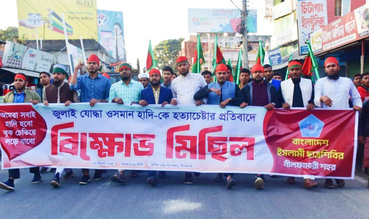 ঢাকা-৮ আসনের স্বতন্ত্র প্রার্থী ও ইনকিলাব মঞ্চের নেতা শরীফ ওসমান হাদীর ওপর হামলার প্রতিবাদে নীলফামারীতে বিক্ষোভ মিছিল করেছে বাংলাদেশ ইসলামী ছাত্র শিবির।