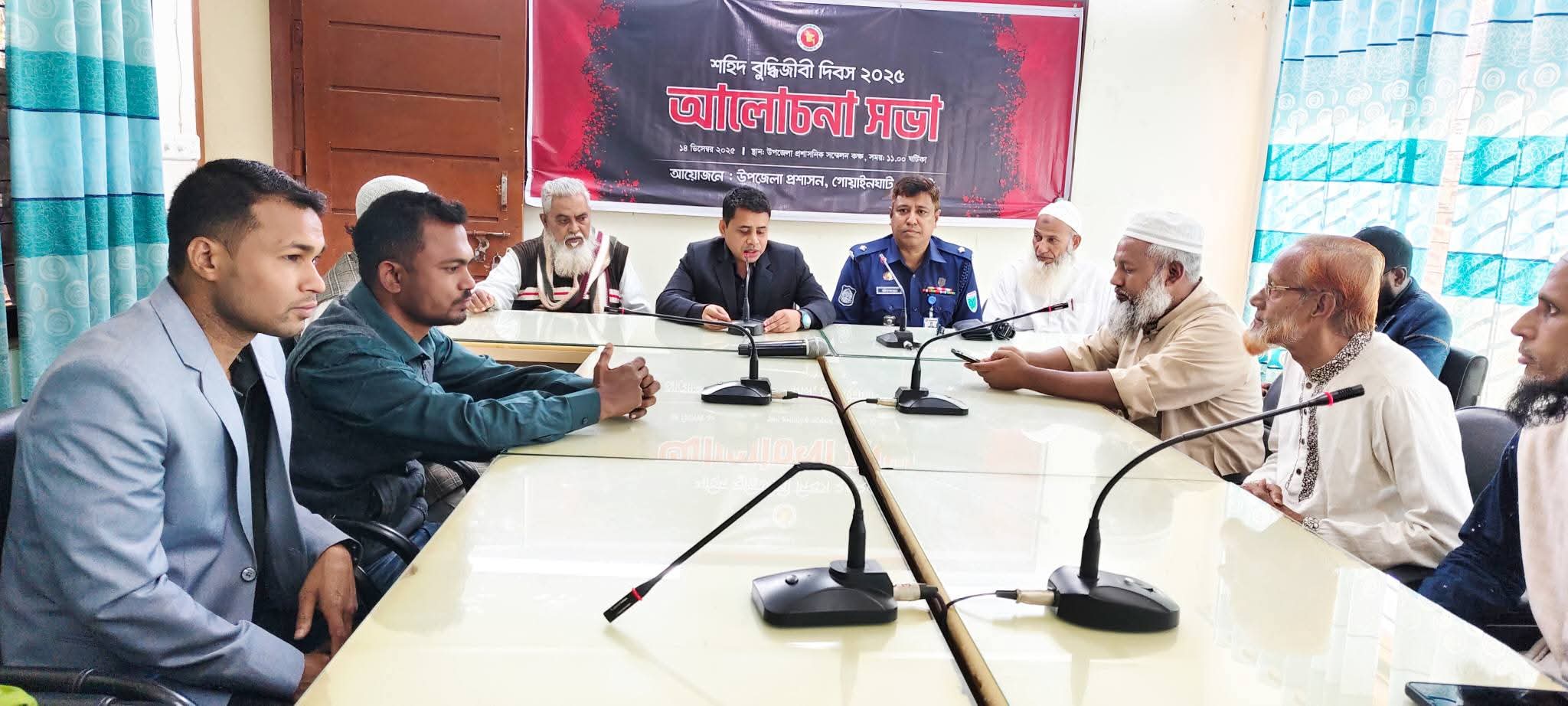 রোববার (১৪ ডিসেম্বর) বেলা ১১টায় উপজেলা প্রশাসনিক ভবনের কনফারেন্স কক্ষে শহীদ বুদ্ধিজীবী দিবস উপলক্ষে আয়োজিত আলোচনা সভায় গোয়াইনঘাট উপজেলা নির্বাহী কর্মকর্তা (ইউএনও) রতন কুমার অধিকারীর সভাপতিত্বে ও সঞ্চালনায় উপস্থিত ছিলেন ও বক্তব্য রাখেন গোয়াইনঘাট থানার অফিসার ইনচার্জ মোহাম্মদ মনিরুজ্জামান, উপজেলা কৃষি কর্মকর্তা রায়হান পারভেজ রনি, উপজেলা মুক্তিযোদ্ধা সংসদের যুগ্ম আহবায়ক ইসমাইল হোসেন সুরুজ, সাবেক কমান্ডার খায়রুল ইসলাম, উপজেলা পরিষদের সাবেক ভাইস চেয়ারম্যান মাওলানা গোলাম আম্বিয়া কয়েছ, জাতীয় নাগরিক পার্টির গোয়াইনঘাট উপজেলা শাখার প্রধান সমন্নয়কারী হাফিজ মৌলভী আব্দুল হাফিজ, গোয়াইনঘাট প্রেসক্লাবের সাধারণ সম্পাদক মোঃ করিম মাহমুদ লিমন, উপজেলা রিপোর্টার্স ক্লাবের সাধারণ সম্পাদক ইমরান আহমদ, জুলাই যোদ্ধা সংসদ সিলেট জেলা শাখার আহ্বায়ক আব্দুর রহিমসহ বীর মুক্তিযোদ্ধা, প্রশাসনিক, সামাজিক ও রাজনৈতিক নেতৃবৃন্দ।