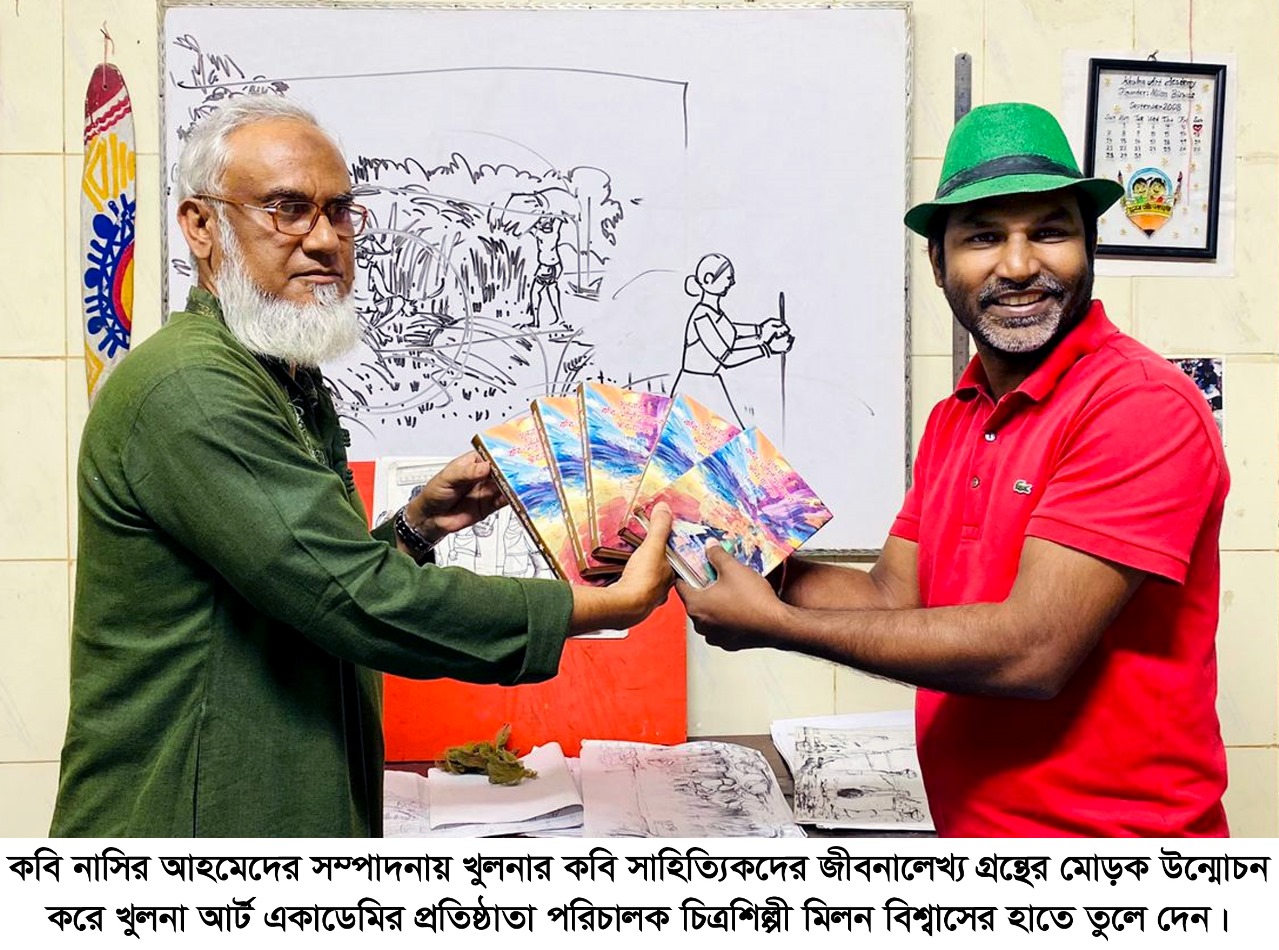 খুলনার কবি ও সাহিত্যিকদের জীবন ও সাহিত্যকর্ম সংরক্ষণের লক্ষ্যে প্রকাশিত হয়েছে গুরুত্বপূর্ণ গ্রন্থ “খুলনার কবি–সাহিত্যিকদের জীবনালেখ্য”। কবি নাসির আহমেদের সম্পাদনায় প্রকাশিত এই গ্রন্থটি বিজয় দিবসের দিন সকাল ১০ ঘটিকায় খুলনা আর্ট একাডেমিতে এসে চিত্রশিল্পী মিলন বিশ্বাসের হাতে তুলে দিয়ে বলেন বইটির ভূমিকার অংশে উল্লেখ করেছি আপনার নাম। কারণ এই বইটির কবিদের জীবনী সংগ্রহ করতে আপনি আমাকে সহযোগিতা করেছেন। এ সময় চিত্রশিল্পী মিলন বিশ্বাস বইটি হাতে তুলে নিয়ে অত্যন্ত আনন্দিত এবং তাৎক্ষণিক বিশ্ববিদ্যালয়ের ভর্তি ইচ্ছুক নবীন চারু শিল্পীরা বইটি খুলে দেখেন। এবং তারাও খুব আনন্দিত হন। গ্রন্থটিতে খুলনা বিভাগের ৩১৭ জন কবি ও সাহিত্যিকের সংক্ষিপ্ত জীবনালেখ্য স্থান পেয়েছে। চিত্রশিল্পী মিলন বিশ্বাস বলেন দীর্ঘদিন ধরে অবহেলিত ও অপ্রকাশিত সাহিত্যসাধকদের জীবন ও অবদান সংরক্ষণে এটি একটি ঐতিহাসিক দলিল হিসেবে বিবেচিত হচ্ছে। নিজ উদ্যোগ ও নিজ অর্থায়নে কবি নাসির আহমেদ খুলনা বিভাগের বিভিন্ন অঞ্চল ঘুরে তথ্য সংগ্রহ করে এই গ্রন্থ সম্পাদনা করেন। এ উপলক্ষে কবি নাসির আহমেদ বলেন, “এই কাজ সফল হোক বা ব্যর্থ, নীরবে ও নিষ্ঠার সঙ্গে সাহিত্যভিত্তিক দায়িত্ব পালন করাটাই আমার কাছে সবচেয়ে বড় প্রাপ্তি।”চিত্রশিল্পী মিলন বিশ্বাস এই উদ্যোগকে খুলনার সাহিত্য ও সংস্কৃতি অঙ্গনের জন্য একটি মাইলফলক হিসেবে উল্লেখ করে কবি নাসির আহমেদের প্রতি কৃতজ্ঞতা প্রকাশ করেন।গ্রন্থটির পরবর্তী পর্বে বাদপড়া কবি ও সাহিত্যিকদের অন্তর্ভুক্ত করার পরিকল্পনা রয়েছে বলে সম্পাদক জানিয়েছেন। খুলনা আর্ট একাডেমির প্রতিষ্ঠাতা পরিচালক চিত্রশিল্পী মিলন বিশ্বাস খুলনার কবি সাহিত্যিকদের জীবনা লেখ্য প্রথম খন্ড প্রকাশ করায় কবি নাসির আহমেদকে ধন্যবাদ জানান।