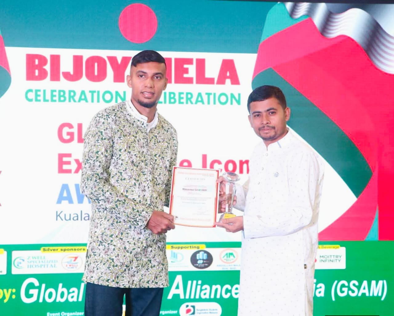 মহান বিজয় দিবস উপলক্ষে ২০ শে ডিসেম্বর, শনিবার, গ্লোবাল স্টুডেন্ট এলায়েন্স মালয়েশিয়া কর্তৃক আয়োজিত বিজয় উৎসব -২০২৫ ও গ্লোবাল এক্সিলেন্স আইকন অ্যাওয়ার্ড অনুষ্ঠান মালেশিয়া কুয়ালালামপুর জি টাওয়ার হোটেলে সন্ধ্যা ৬ টায় অনুষ্ঠিত হয়েছে। অনুষ্ঠানে ব্যবসায়ী উদ্যোক্তা ক্যাটাগরিতে বাংলাদেশ জাতীয় ফুটবল দলের ক্যাপ্টেন জামাল ভূঁইয়া থেকে গ্লোবাল এক্সিলেন্স আইকন অ্যাওয়ার্ড ২০২৫ গ্রহণ করেন মালেশিয়ার স্বনামধন্য প্রবাসী ব্যবসায়ী ও লোহাগাড়া উপজেলা পদুয়ার কৃতি সন্তান মোহাম্মদ শাহাব উদ্দিন সিআইপি।