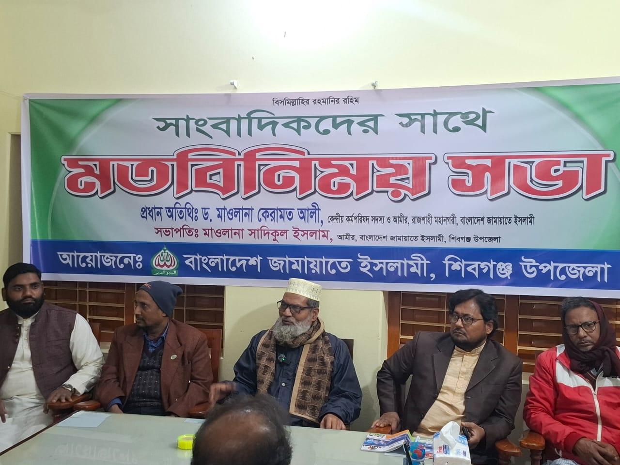 চাঁপাইনবাবগঞ্জের শিবগঞ্জ উপজেলায় সাংবাদিকদের সঙ্গে মতবিনিময় সভা অনুষ্ঠিত হয়েছে। বাংলাদেশ জামায়াতে ইসলামী শিবগঞ্জ উপজেলা শাখার উদ্যোগে বুধবার (২৪ ডিসেম্বর ২০২৫) সকাল ১১টায় শিবগঞ্জ উপজেলা জামায়াতে ইসলামীর কার্যালয়ে এ সভা অনুষ্ঠিত হয়।