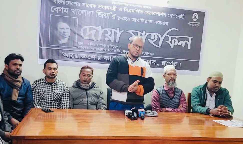 সাবেক প্রধানমন্ত্রী ও বাংলাদেশ জাতীয়তাবাদী দল (বিএনপি)-এর চেয়ারপার্সন প্রয়াত বেগম খালেদা জিয়ার স্মরণে রংপুরের কাউনিয়া প্রেসক্লাবের উদ্যোগে স্মরণ সভা ও দোয়া মাহফিল অনুষ্ঠিত হয়েছে।