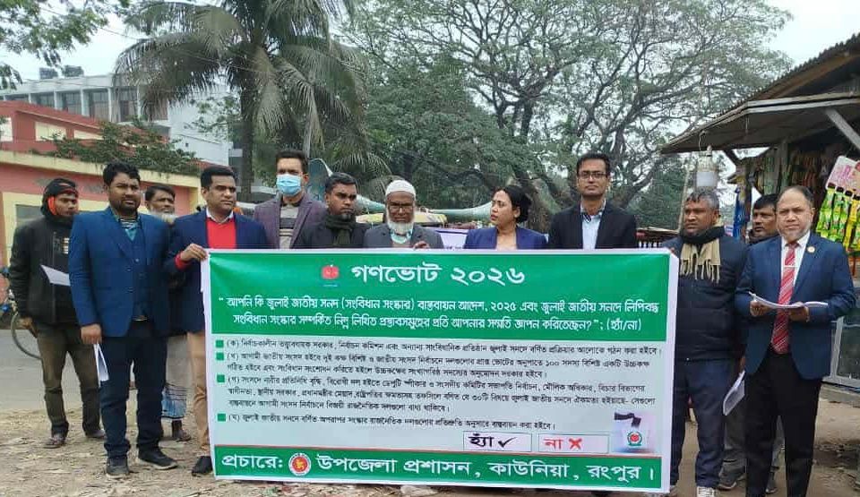 গণভোট বিষয়ে সাধারণ মানুষের মধ্যে ব্যাপক জনসচেতনতা তৈরির লক্ষ্যে সারাদেশে ব্যানার ও লিফলেটের মাধ্যমে প্রচারণা চালানোর সিদ্ধান্ত নিয়েছে নির্বাচন কমিশন (ইসি)। এরই ধারাবাহিকতায় রংপুরের কাউনিয়া উপজেলায় গণভোট বিষয়ে প্রচার-প্রচারণা চালিয়েছে উপজেলা প্রশাসন।