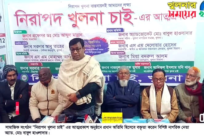 একটি অ-রাজনৈতিক ও সামাজিক সংগঠন নিরাপদ খুলনা চাই এর একটি আড়ম্বরপূর্ণ আত্মপ্রকাশ অনুষ্ঠান গতকাল মঙ্গলবার সন্ধ্য ৬.০০ টায় খুলনা বিশ্ববিদ্যালয়ের সামনে সংগঠন কার্যালয়ে অনুষ্ঠিত হয়। সংগঠনের সভাপতি সরদার বাদশা’র সভাপতিত্বে অনুষ্ঠিত আত্মপ্রকাশ অনুষ্ঠানে প্রধান অতিথি হিসেবে উপস্থিত ছিলেন বিশিষ্ট নাগরিক নেতা, পরিবেশবিদ, খুলনা নাগরিক সমাজের সদস্য সচিব অ্যাডঃ মোঃ বাবুল হাওলাদার। আত্মপ্রকাশ অনুষ্ঠানে শুভ উদ্বোধন ঘোষণা করেন খুলনা বিশ্ববিদ্যালয়ের অবসরপ্রাপ্ত শিক্ষক, বিশিষ্ট শিক্ষাবিদ প্রফেসর ড. মোঃ আব্দুল মান্নান, প্রধান বক্তা ছিলেন আইন ও অধিকার বাস্তবায়ন ফোরামের খুলনা বিভাগীয় সভাপতি, নাগরিক নেতা এস এম দেলোয়ার হোসেন, সম্মানীত অতিথি নাগকির নেতা, সাংবাদিক, রোটাঃ আলহাজ্ব সরদার আবু তাহের, বিশেষ আলোচক সাংবাদিক মিয়া বদরুল আলম এবং বিশেষ অতিথি হিসেবে উপস্থিত ছিলেন খুলনা বিশ্ববিদ্যালয় অফিসার্স কল্যাণ পরিষদের সাধারণ সম্পাদক এস এম মোহাম্মাদ আলী। সংগঠনের সাধারণ সম্পাদক ইয়ারুল ইসলাম সবুজ এবং সিনিয়র সহ-সভাপতি কবি নাজমুল তারেক তুষার এর সঞ্চালনায় অন্যান্যের মধ্যে বক্তৃতা করেন ও উপস্থিত ছিলেন বিশিষ্ট সমাজ সেবক শাহীনুর রহমান, শিরোমনি যুব উন্নয়ন সংস্থার প্রমি আক্তার লিজা, অ্যাডঃ তারেক শাহরিয়ার মেজবাহ, গাজী সালাহ উদ্দিন আনসারী, আব্দুল্লাহ আল মামুন, কিংকর রাহা, মোঃ আব্দুল আলিম, মনিরা মনি, সুমাইয়া আক্তার, সাদিয়া আক্তার প্রমুখ। এসময় প্রধান অতিথি নতুন সংগঠনের নির্বাচিত কমিটি ঘোষণা করেন।