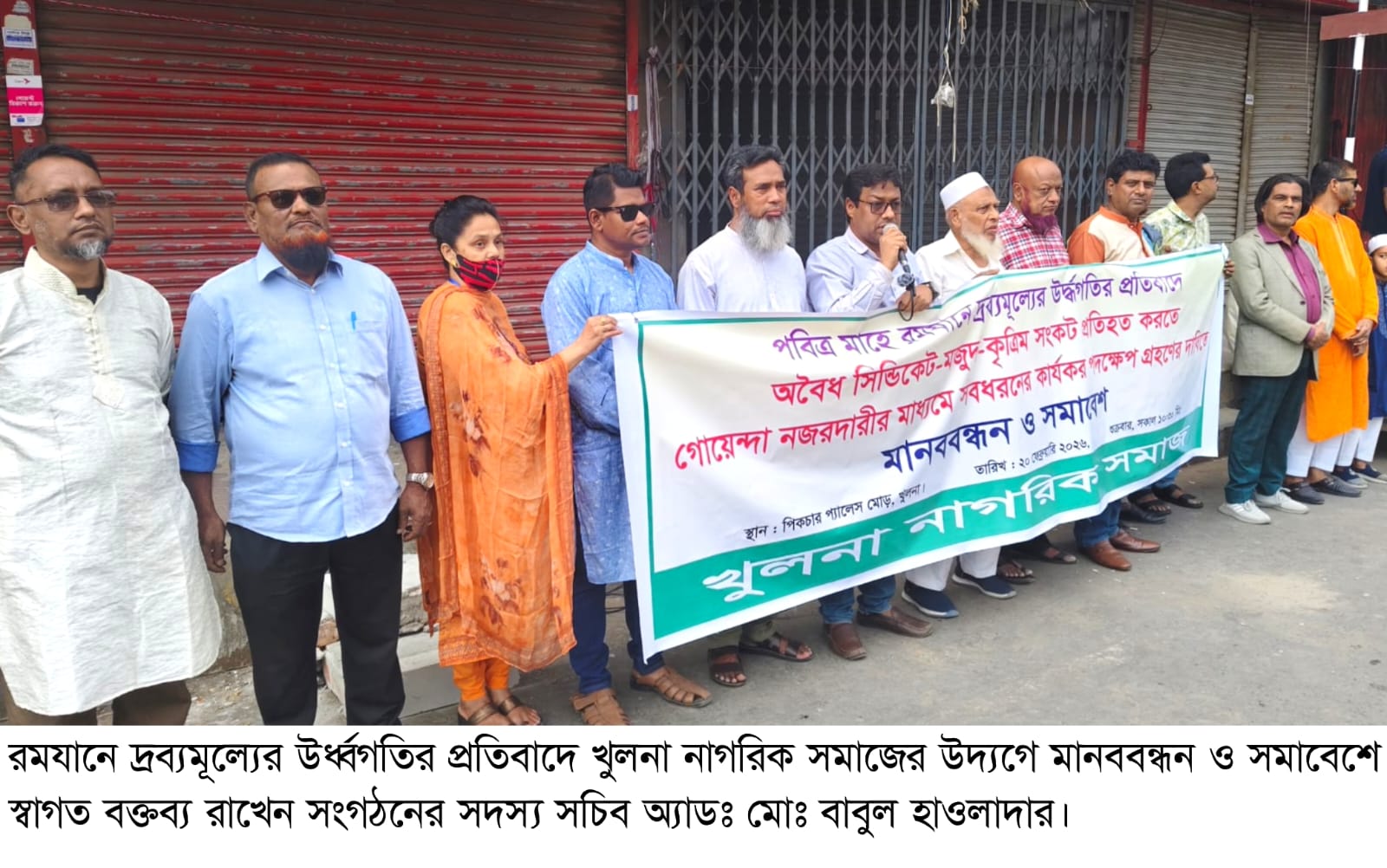 খুলনা নাগরিক সমাজের মানববন্ধন ও সমাবেশে বক্তারা রমযানে দ্রব্যমূল্য নিয়ন্ত্রণে গোয়েন্দা নজরদারির মাধ্যমে অবৈধ সিন্ডিকেটের বিরুদ্ধে সর্বোচ্চ কঠোর হতে হবে