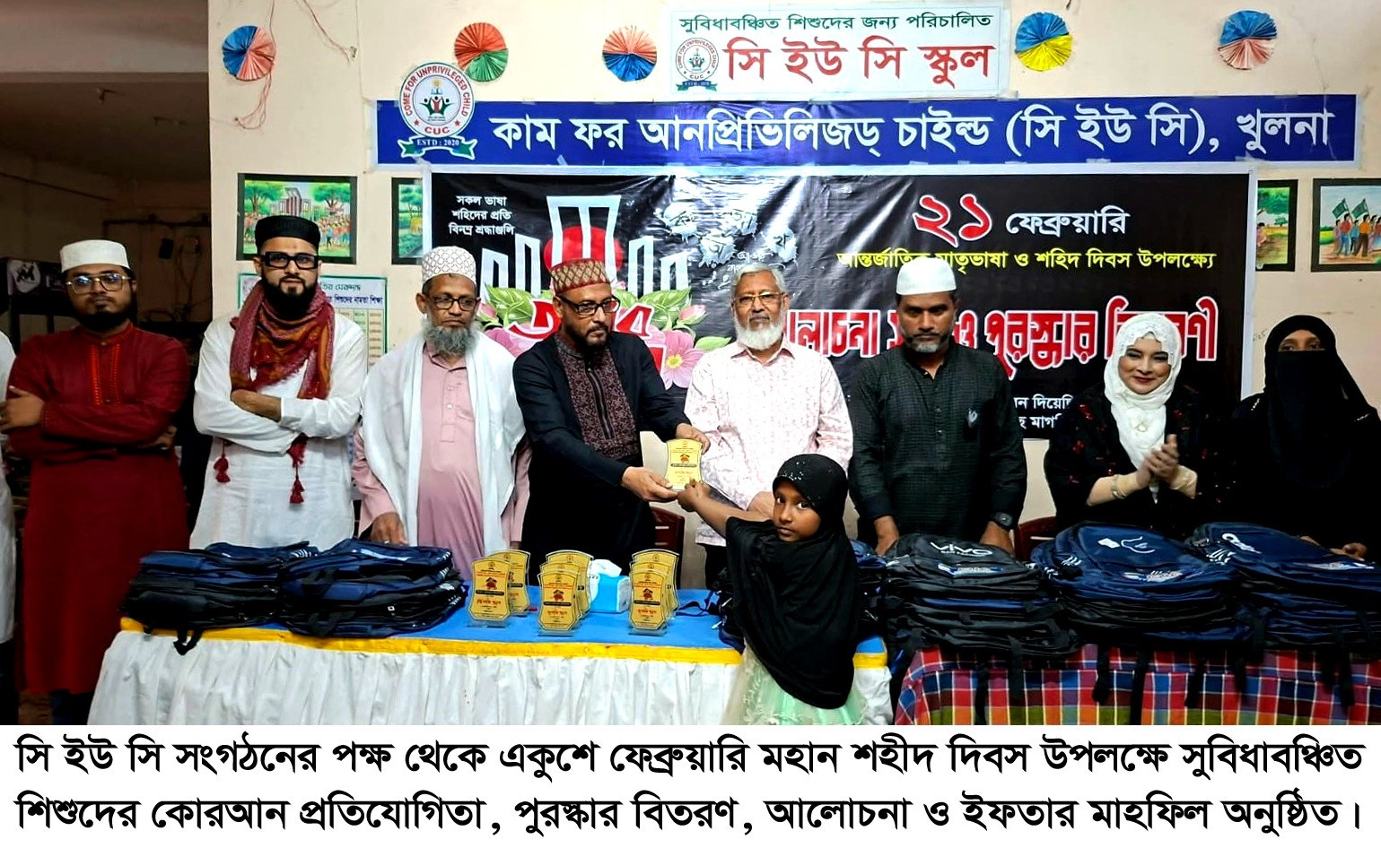 সুবিধাবঞ্চিত শিশু ও দরিদ্র মানুষের কল্যাণে নিবেদিত সামাজিক সংগঠন কাম ফর আনপ্রিভিলিজড চাইল্ড সিইউসি খুলনা কর্তৃক একুশে ফেব্রুয়ারি মহান শহীদ দিবস উপলক্ষে সুবিধাবঞ্চিত শিশুদের কোরআন প্রতিযোগিতা, পুরস্কার বিতরণী,আলোচন ও ইফতার মাহফিল অনুষ্ঠিত হয়েছে। গত ২১ ফেব্রুয়ারি শনিবার বিকাল চারটায় সিইউসি স্কুল ৬১ সাউথ সেন্ট্রাল রোড নার্গিস মেমোরিয়াল হসপিটাল খুলনায় সি ইউ সি সংগঠনের সভাপতি জনাব মোঃ শাহিন হোসেন এর সভাপতিত্বে এবং আরিফা ইসলাম খুকুমণির উপস্থাপনায় অনুষ্ঠানে প্রধান অতিথি হিসেবে উপস্থিত ছিলেন শ্রম আদালত খুলনার জাজেস প্যানেল মেম্বার সি ইউ সি সম্মানিত উপদেষ্টা রোটারিয়ান পিপি জনাব মোঃ ইফতেখার আলী বাবু,খুলনা বিবিশিষ্ট্য ব্যবসায়ী রোটারিয়ান জনাব জি এম শরিফুল আলম, সি ইউ সির উপদেষ্টা নেসারিয়া কামিল মাদ্রাসার উপাধ্যক্ষ আলহাজ্ব হযরত মাওলানা ডিএম নুরুল ইসলাম, খুলনা ইউনিয়নী মেডিকেল কলেজের প্রভাষক হেকিম মতিয়ারা, সি ইউ সি সংগঠনের সহ-সভাপতি জনাব শহীদুল্লাহ শহীদ, কোষাধক্ষ্য মিম আক্তার মনিকা, দপ্তর সম্পাদক কারিমা আক্তার, কার্যকরী সদস্য মোঃ সোহান,সি ইউ সি স্কুলের প্রধান শিক্ষক জনাব মোঃ মুজাহিদ হোসেন মিরাজ, সহকারী শিক্ষক হাওয়া রিয়া, ঝরনা আক্তার, সুখী আক্তার, মোহাম্মদ শাহিন, পবন, বর্ষা প্রমুখ। অনুষ্ঠানে সুবিধাবঞ্চিত শিশুদের নিয়ে পবিত্র কোরআন তেলাওয়াত প্রতিযোগিতা এবং বিজয়ীদের মাঝে পুরস্কার বিতরণ করা হয়। আলোচনায় অতিথি বৃন্দ সুবিধাবঞ্চিত শিশুদের সামনে বান্দর ভাষা আন্দোলনে শহীদদের ভূমিকা এবং আন্তর্জাতিক মাতৃভাষা দিবসের তাৎপর্য তুলে ধরেন। আলোচনা শেষে ভাষা শহীদ দিবস ও পবিত্র রমজান উপলক্ষে দেশ ও দেশের মানুষের কল্যাণে এবং ভাষা শহীদদের আত্মার মাগফেরাত কামনায় বিশেষ দোয়া মোনাজাত অনুষ্ঠিত হয়। দোয়া মোনাজাত পরিচালনা করেন সিইওসির উপদেষ্টা ও নেচারিয়া কামিল মাদ্রাসার উপাধ্যক্ষ আলহাজ্ব হযরত মাওলানা দি এম নুরুল ইসলাম। অনুষ্ঠান শেষে অতিথিবৃন্দ সুবিধাবঞ্চিত শিশুদের নিয়ে ইফতার মাহফিলে অংশগ্রহণ করেন।